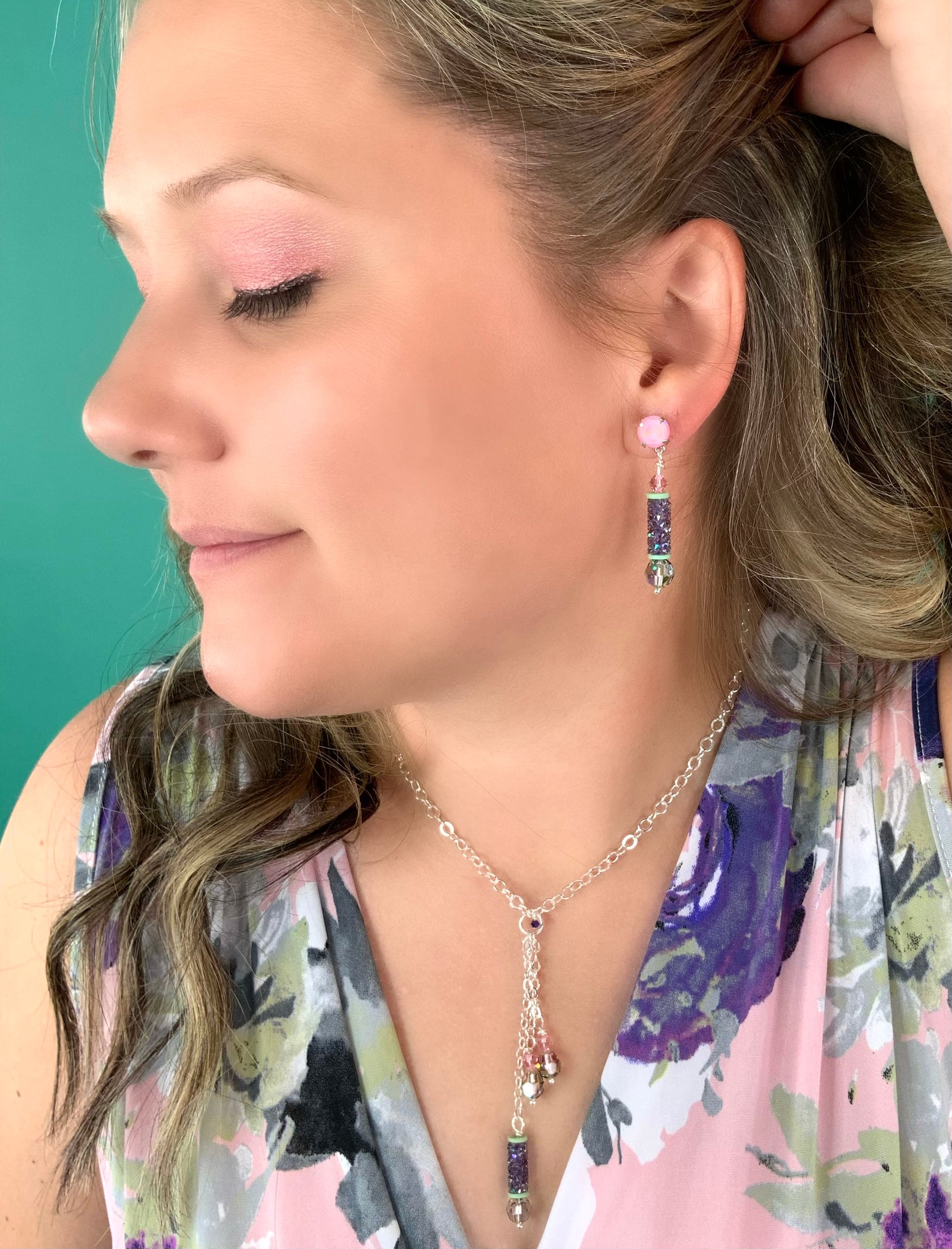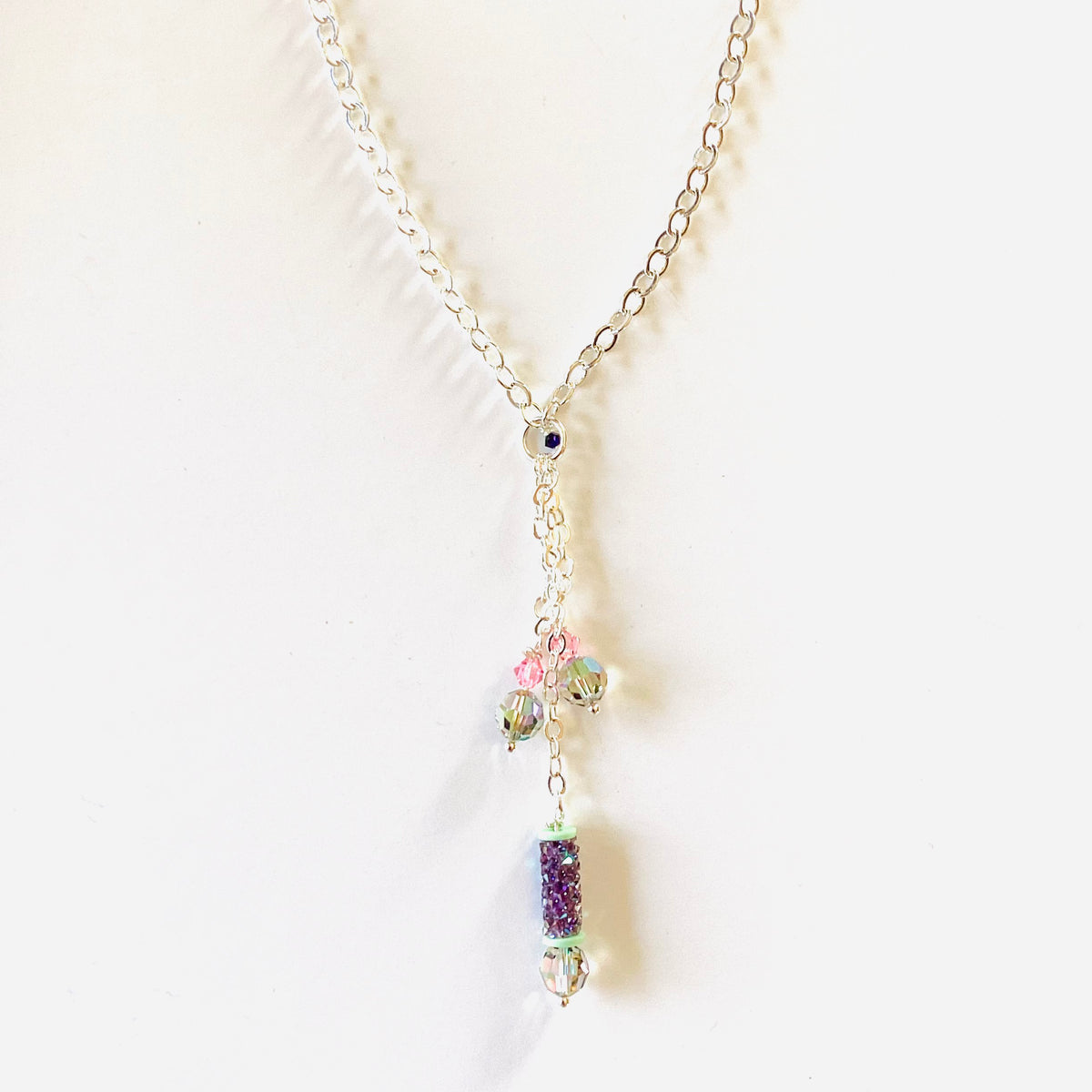 Give Your Heart Necklace set into Shiny Silver Metal with Paradise Shine Crushed Rock Tube Beads with Paradise Shine and Light Rose Crystals.