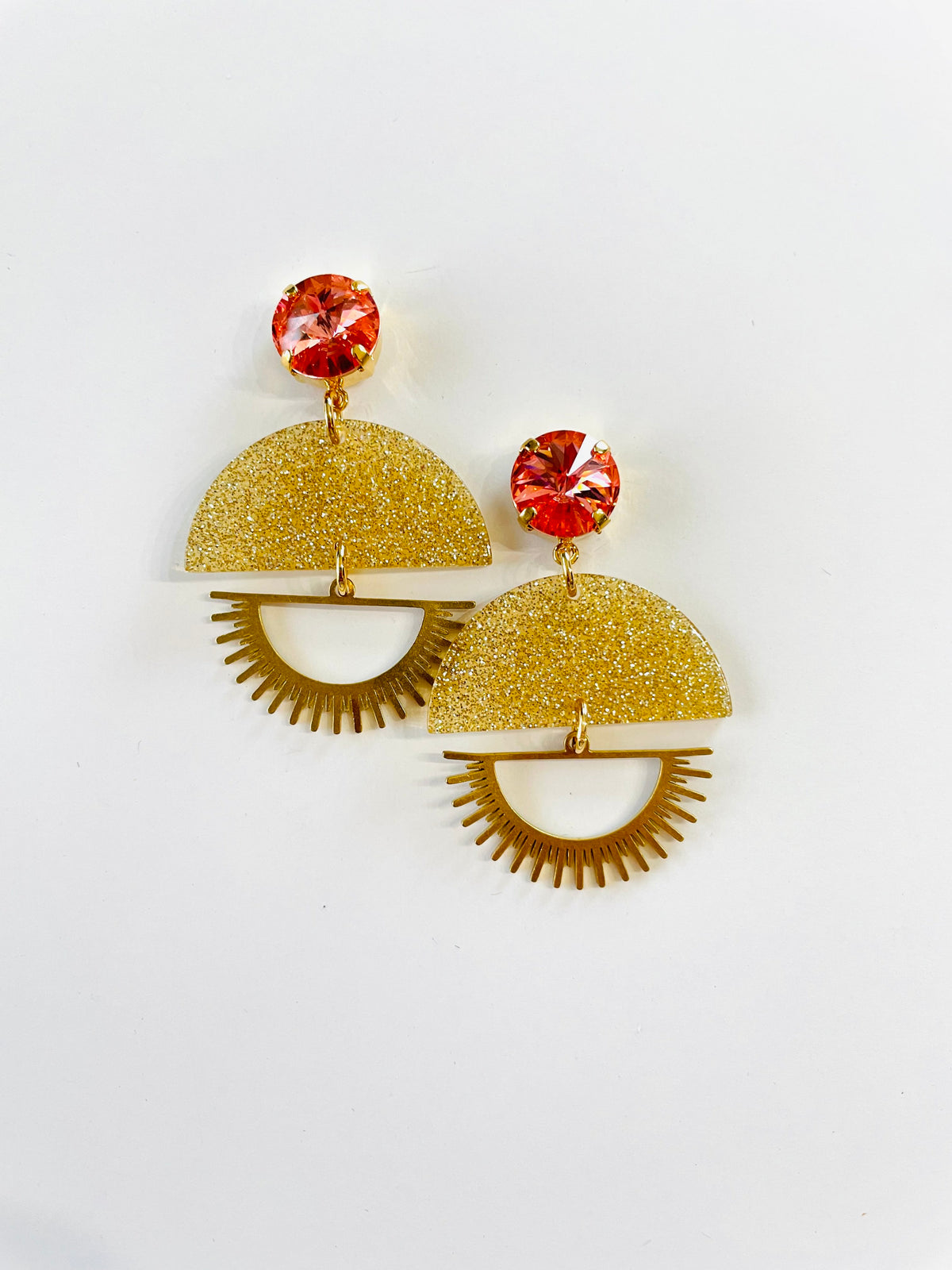 Gold Glitter Goddess Earrings set into Gold Metal with Rose Peach Crystals.