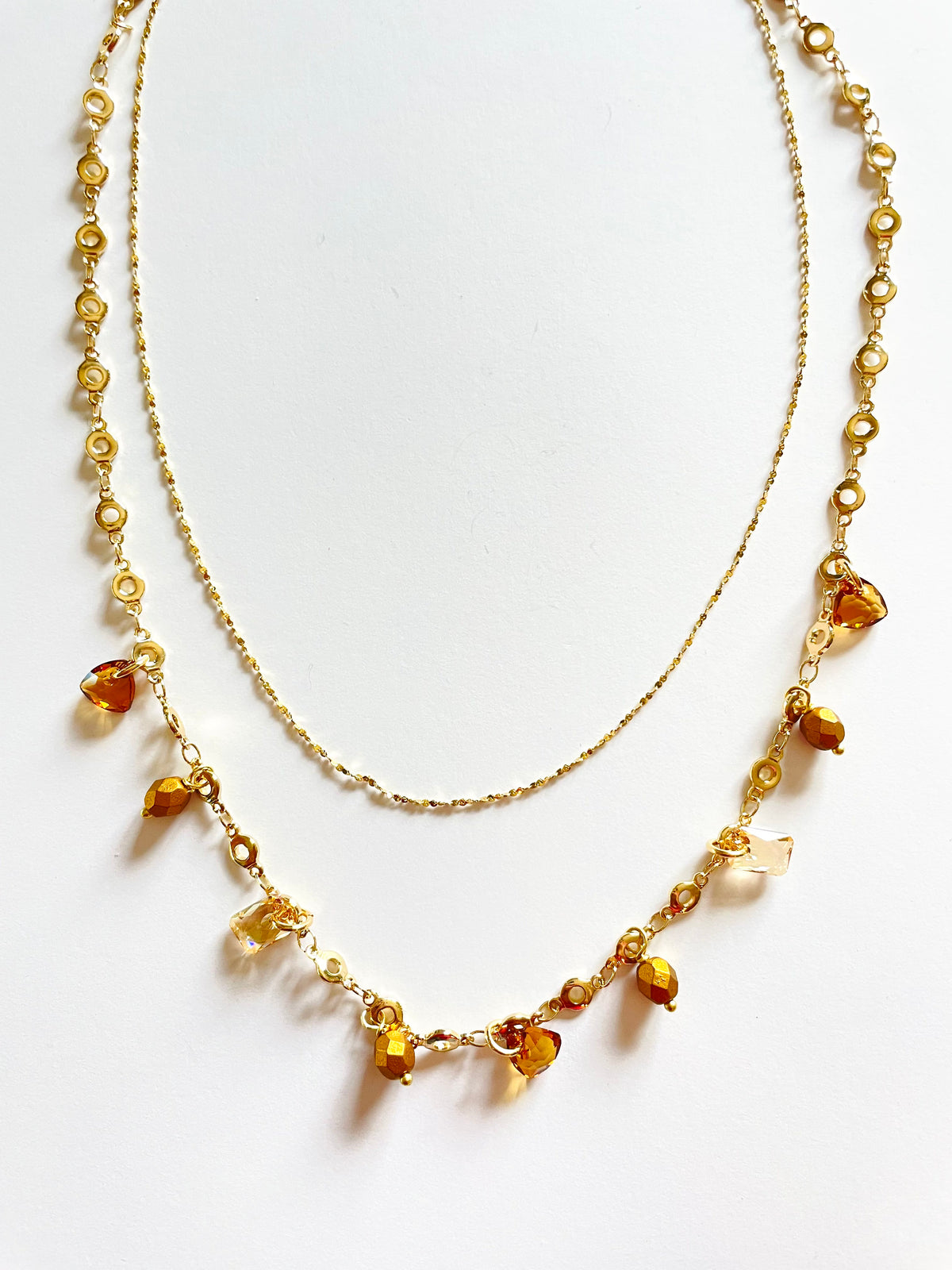 Let the inner glam chic shine in this daringly chic double strand necklace! Show off your unique style with a mix of decorative gold metal, light amber crystals, and golden shadow crystals for a bold statement no one can resist. Shine on!