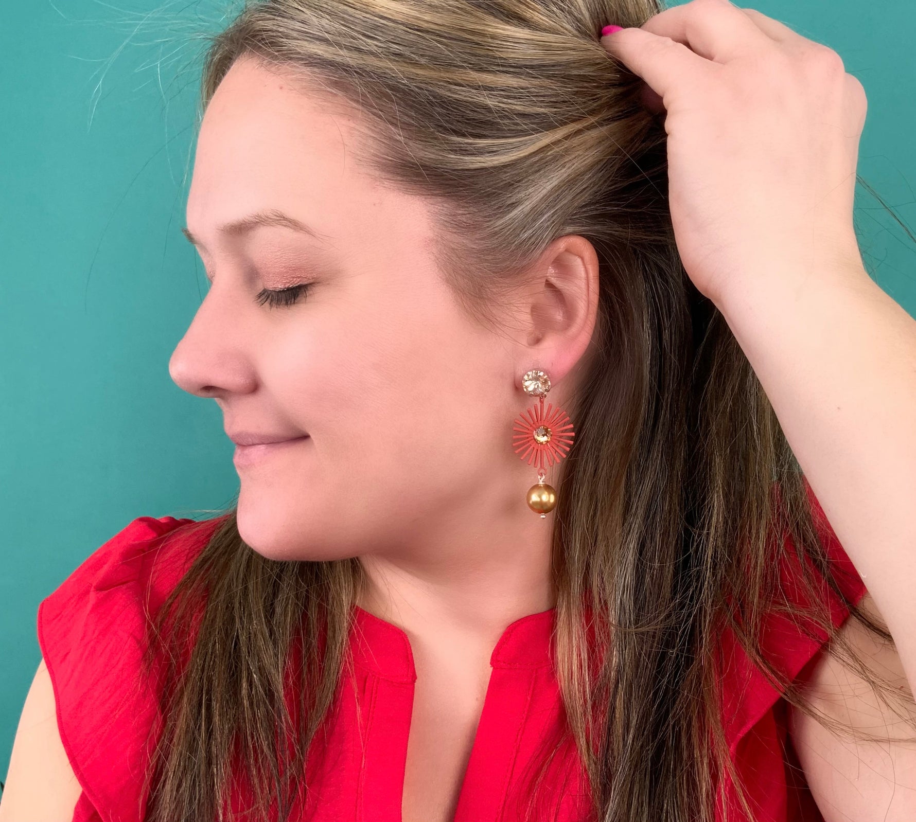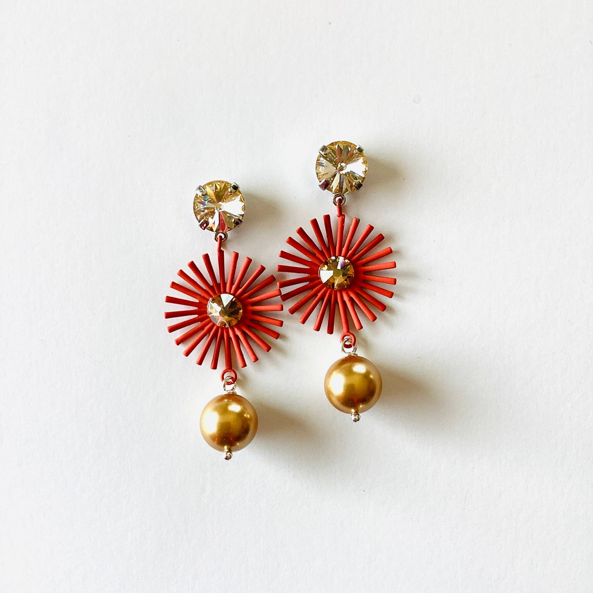 Golden Rays Sunburst Earrings set into Shiny Silver Metal with Champagne and Golden Shadow Crystal and Light Gold Pearls.