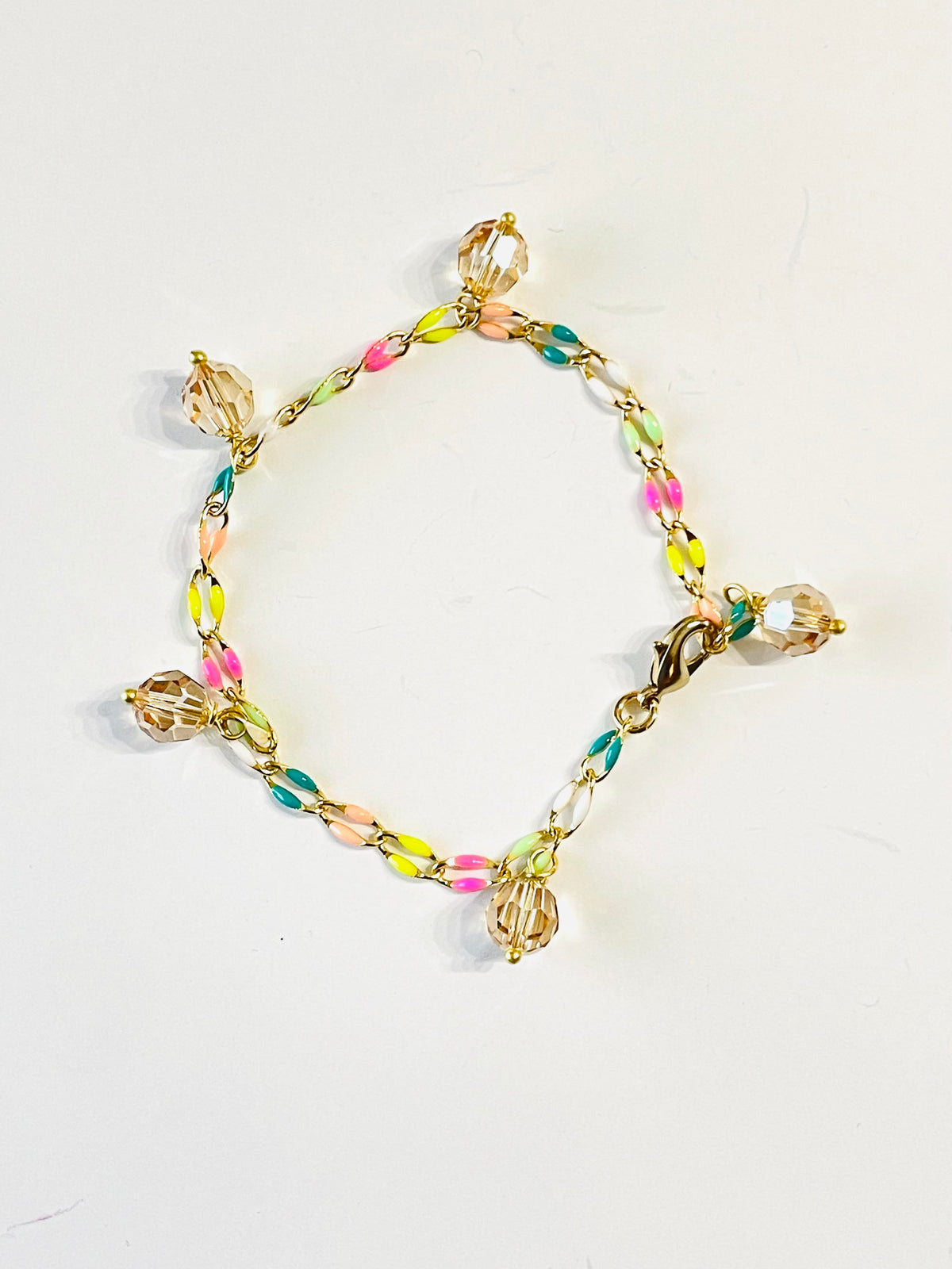 Golden Summer Charm Bracelet with Colorful Enamel Gold Plated Chain and Golden Shadow Crystals.