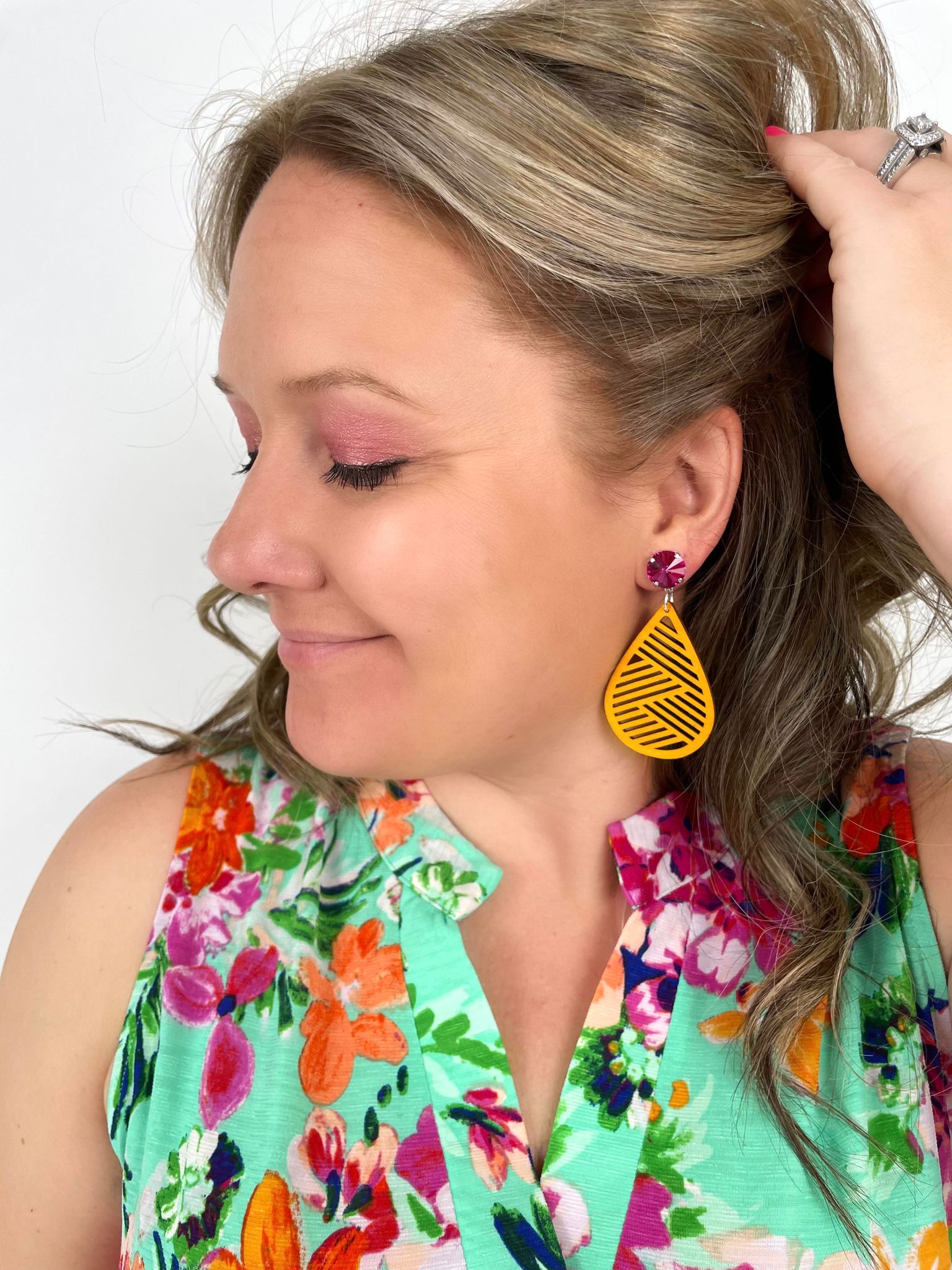 Goldenrod Wood Earrings set into Silver Plated Metal with Fuchsia Crystals and Marigold Wood Pendants