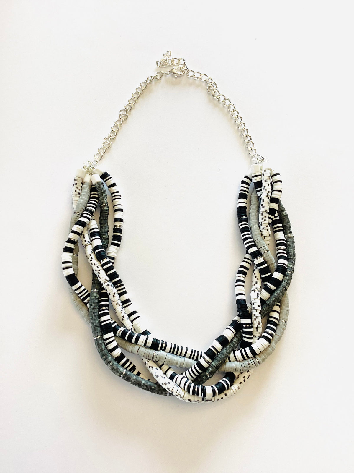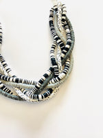 Heishi Beads in Monochrome, Monochrome Confetti, Dark Grey Confetti, and Silver Confetti