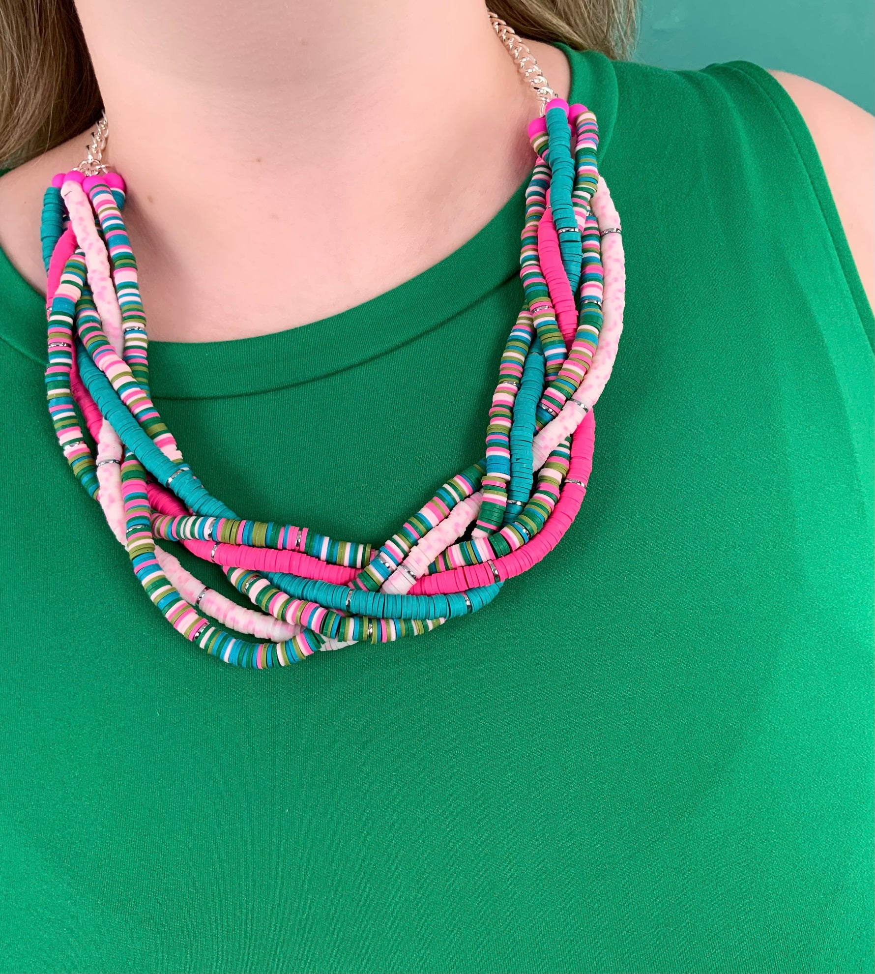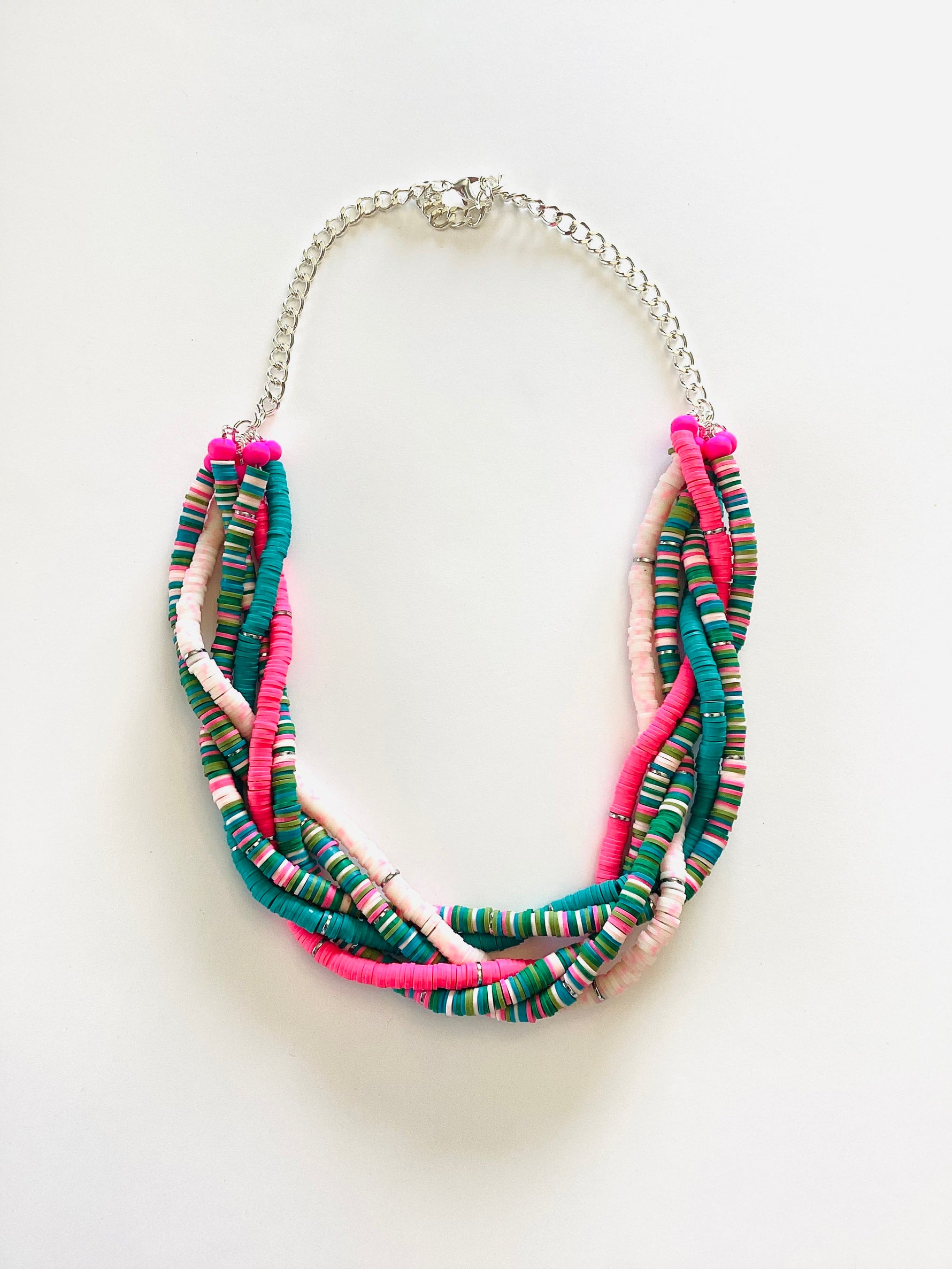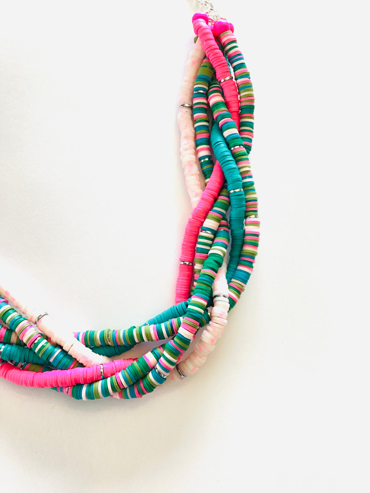This braided statement necklace is AMAZING! Multiple Strands of Heishi Beads braided into a showstopping design!