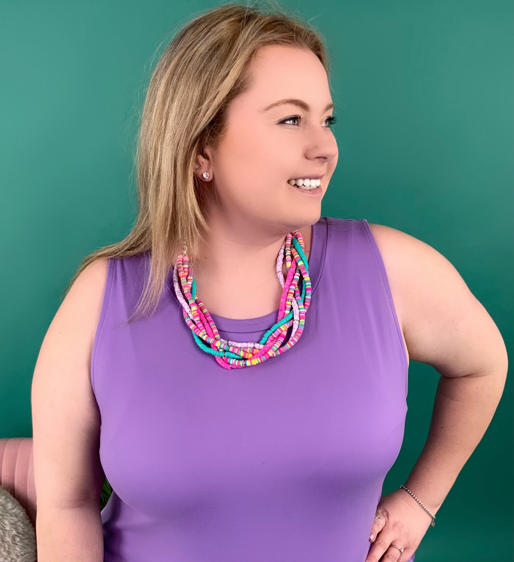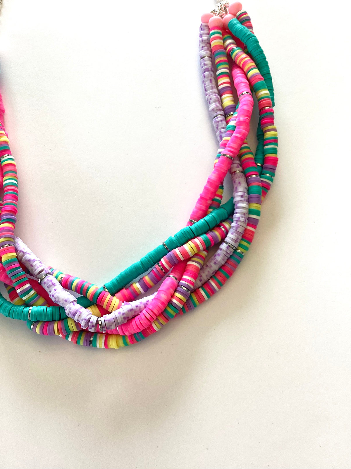 Heishi Beads in Tropicana, Neon Pink Confetti, Lavender Confetti, and Turquoise