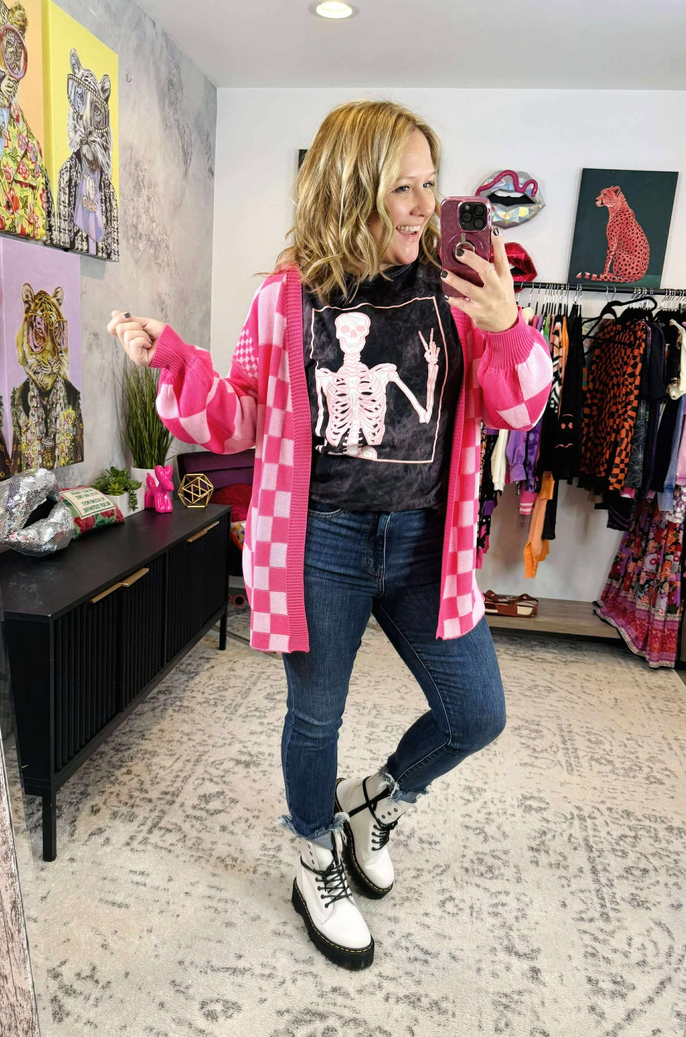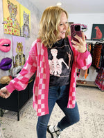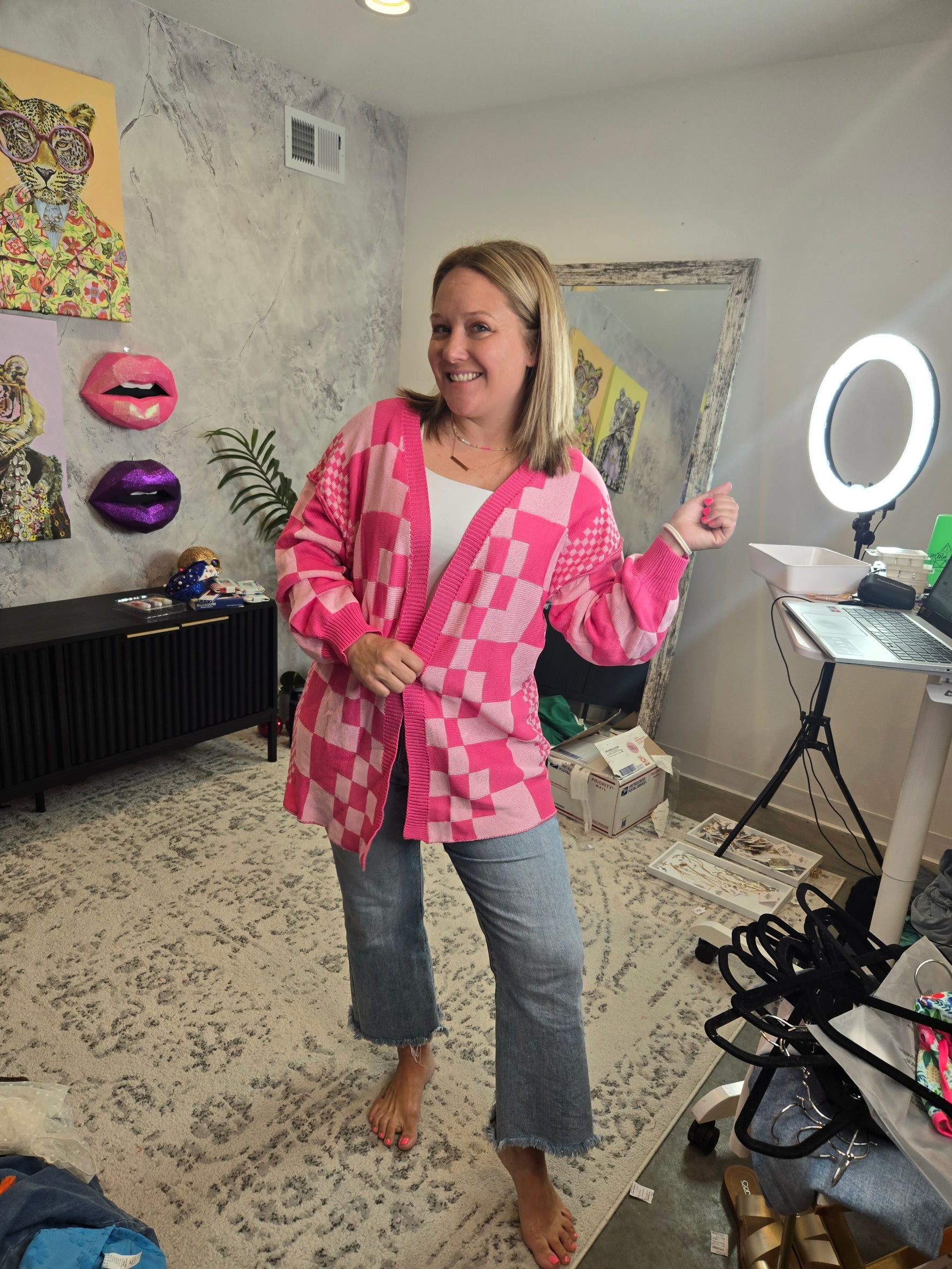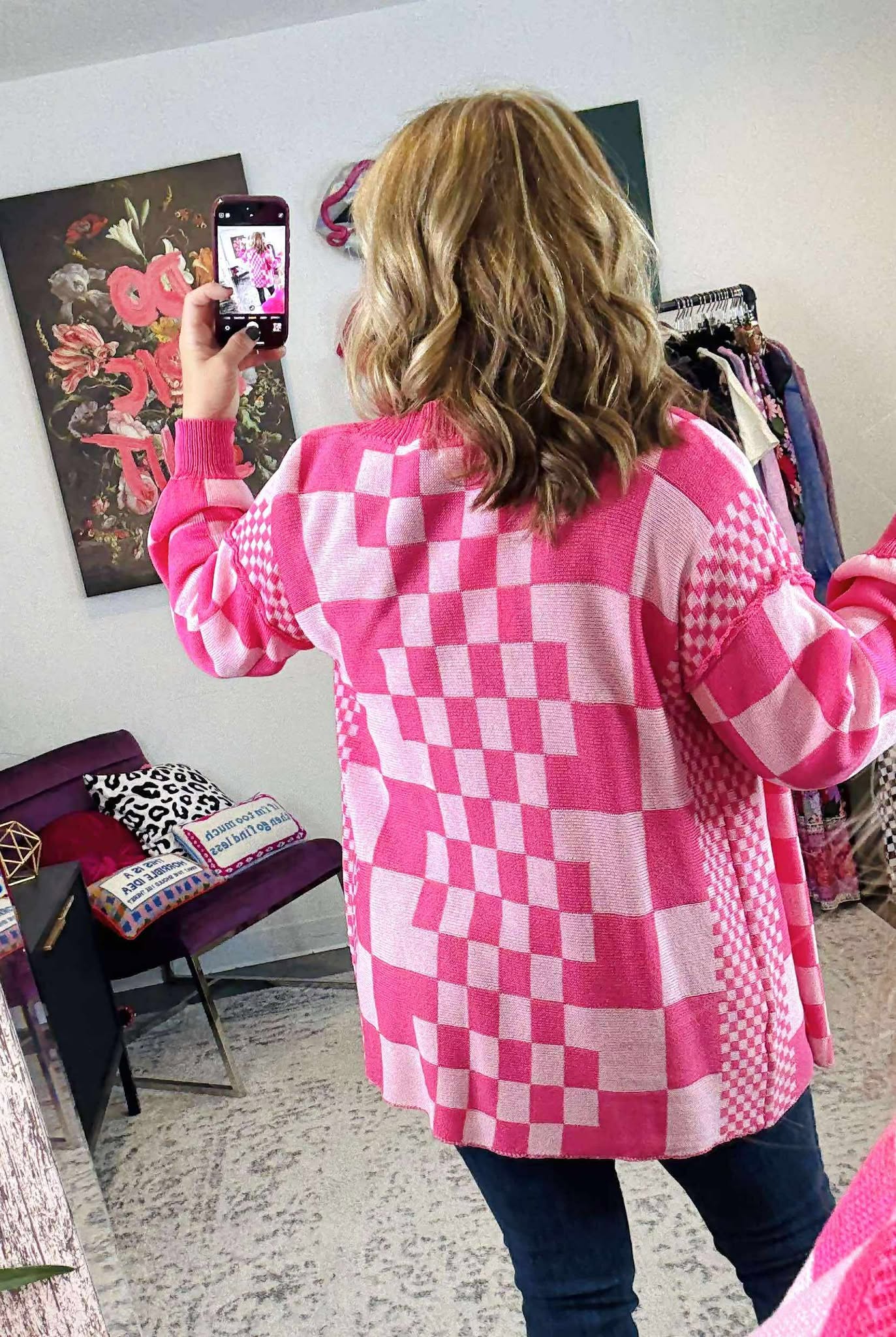 Introducing the perfect addition to your wardrobe - the Everybody Knows Cardigan. This metallic, medium weight sweater features a playful multi checkerboard pattern and an oversized, loose fit for maximum comfort. Don't miss out on this open cardigan that's sure to turn heads.