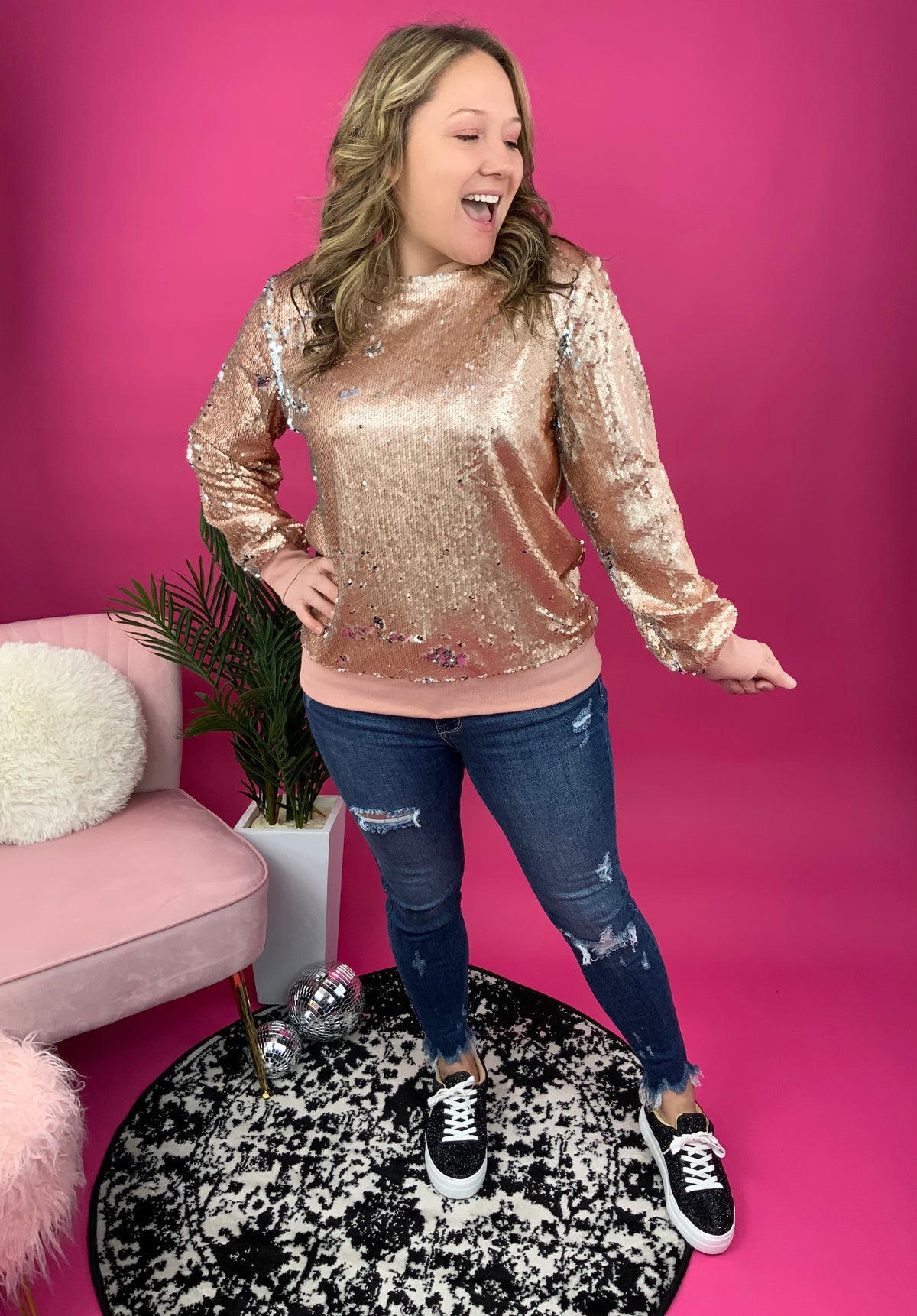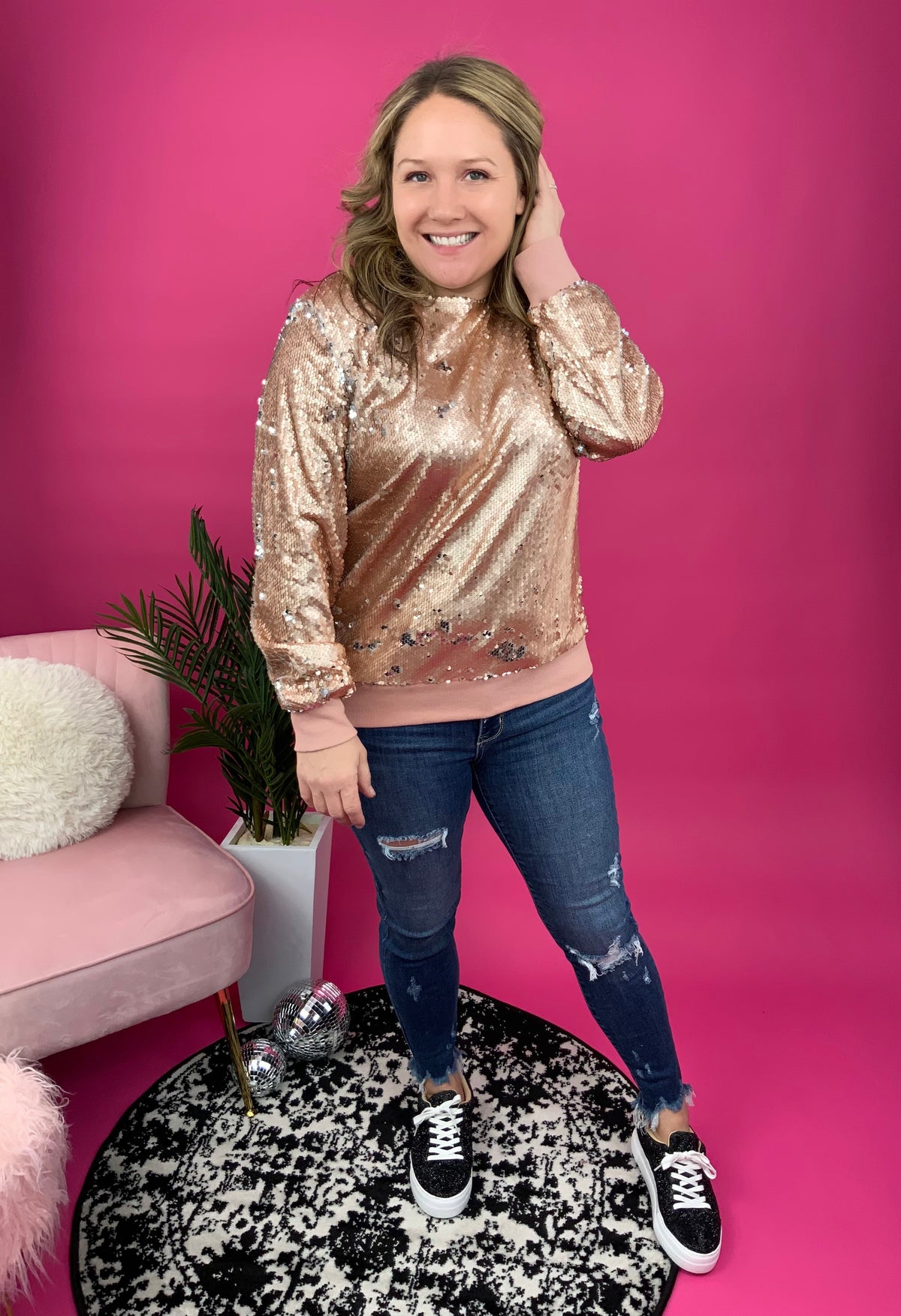 This fun sequin top is just what you are needing in your closet for the season. It features long sleeves, two toned sequins, and cuffs! Perfect for parties and get togethers! You will not be disappointed in this gorgeous top!