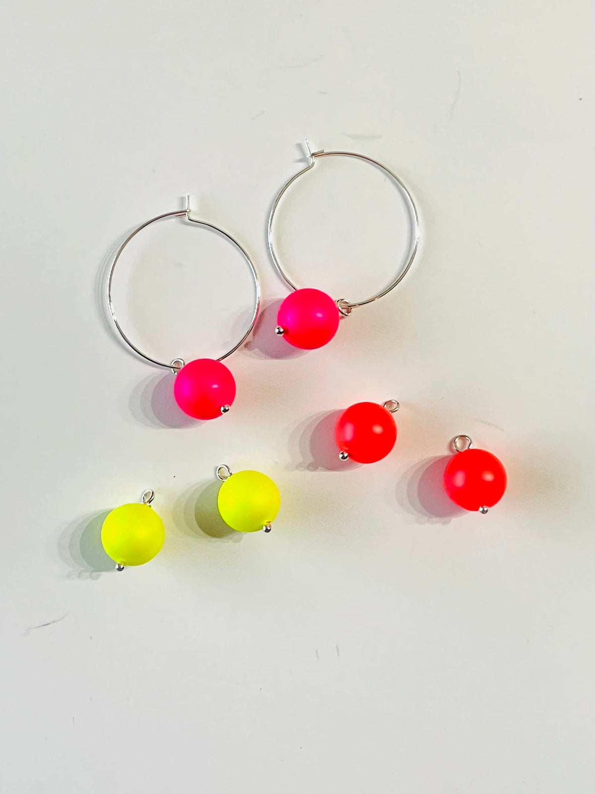 Interchangeable Neon Pearl Charm Earrings. Pearls in Neon Pink, Neon Orange, and Neon Yellow.