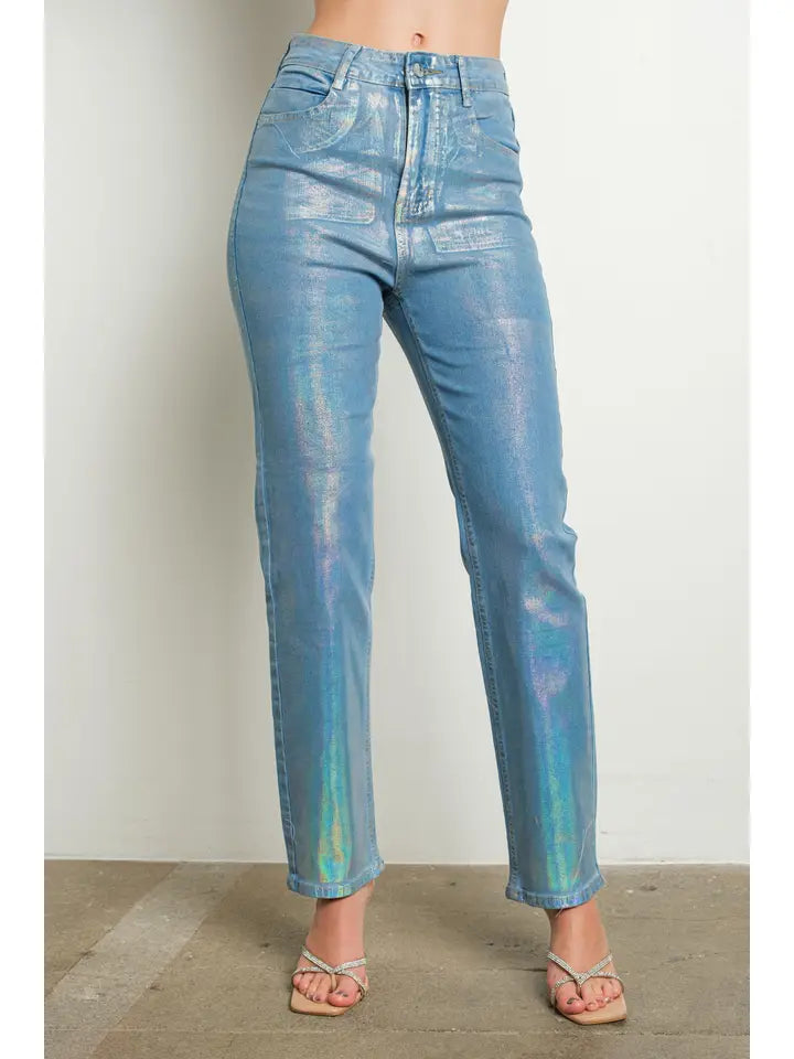 Get ready to shine in our Iridescent Glow Stretch Denim jeans! These jeans feature a unique iridescent metallic foil, making them stand out from the rest. The stretch denim fabric ensures a comfortable fit, while the straight leg style keeps you on trend. Don't miss the fly zip and button closure for added convenience.