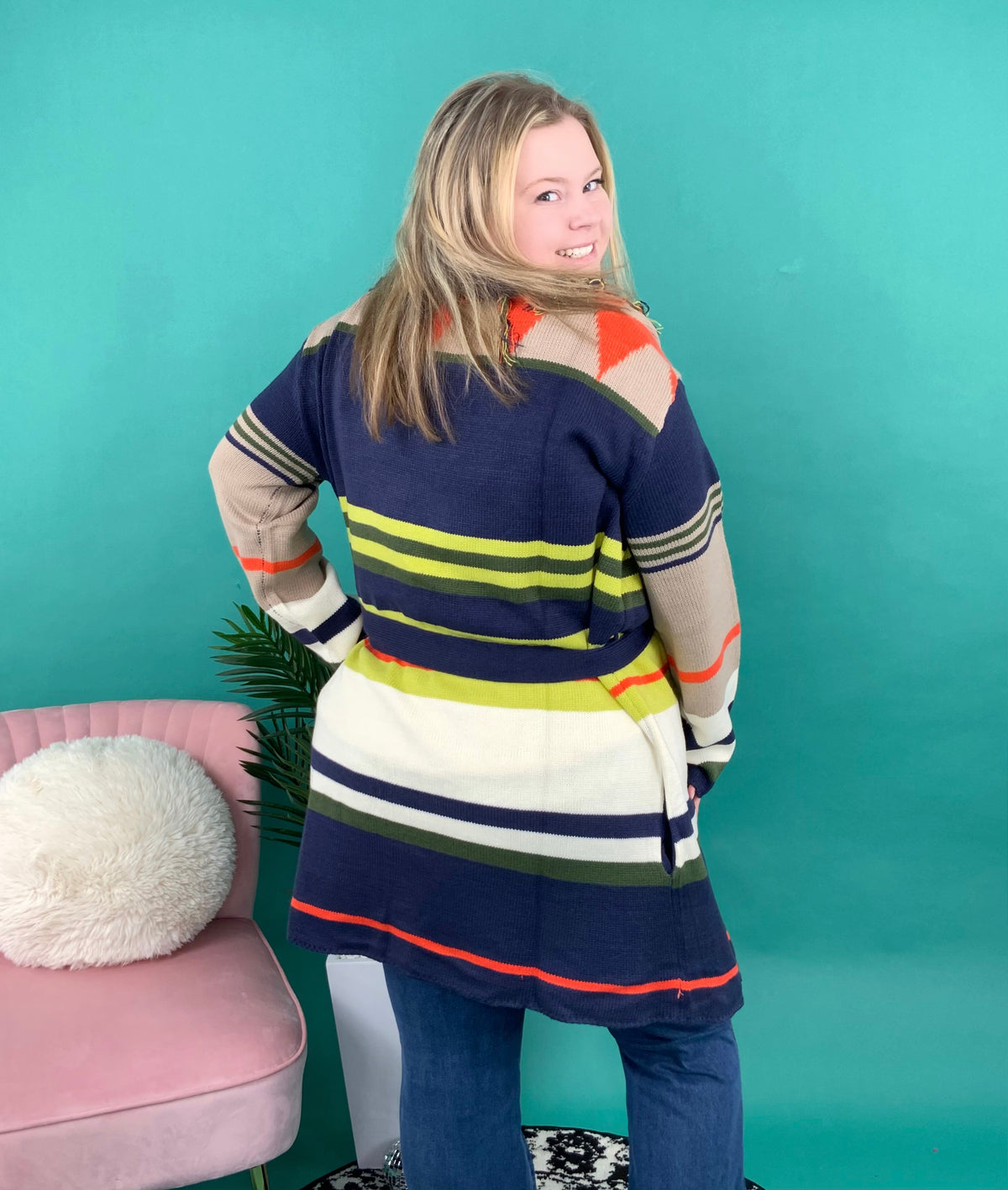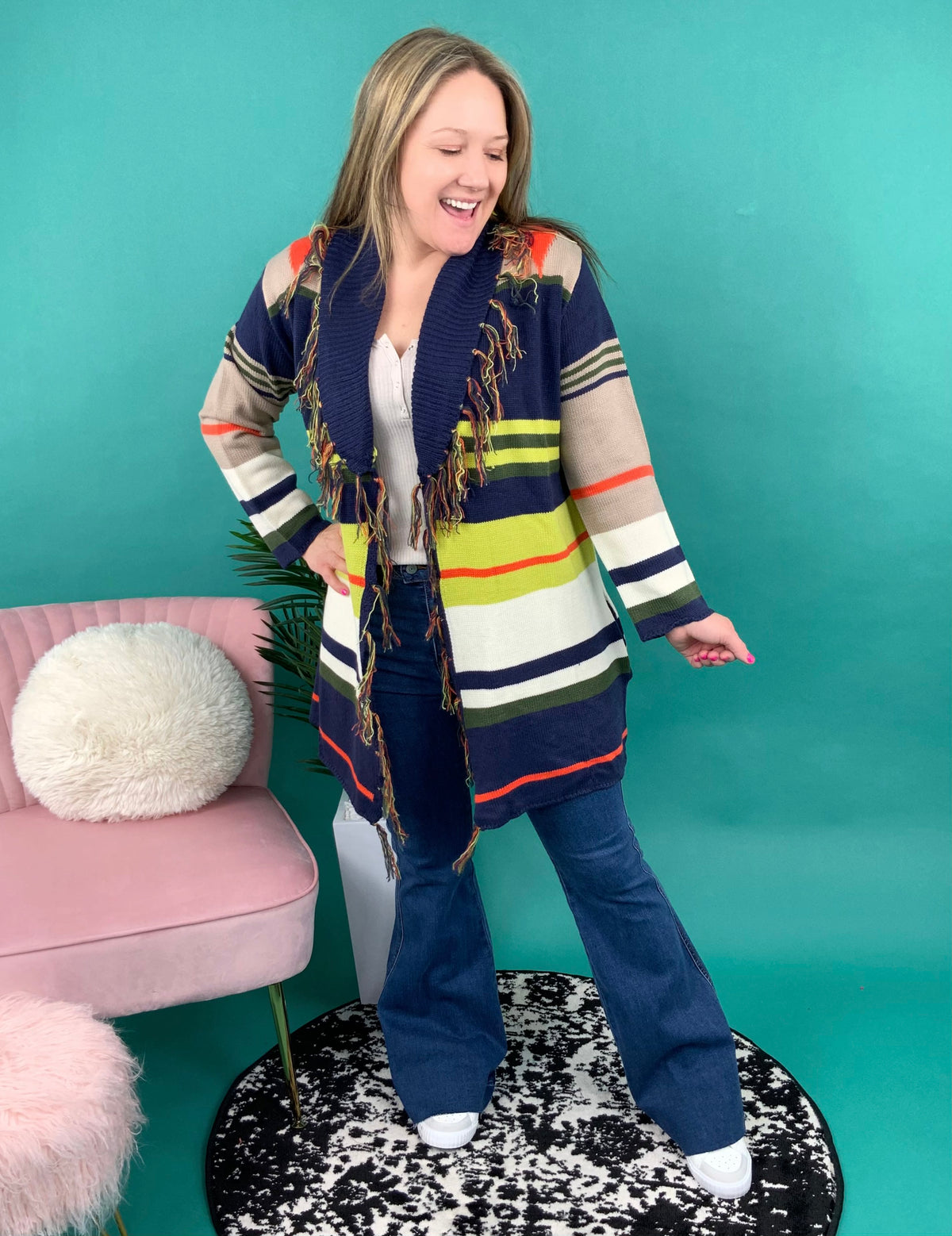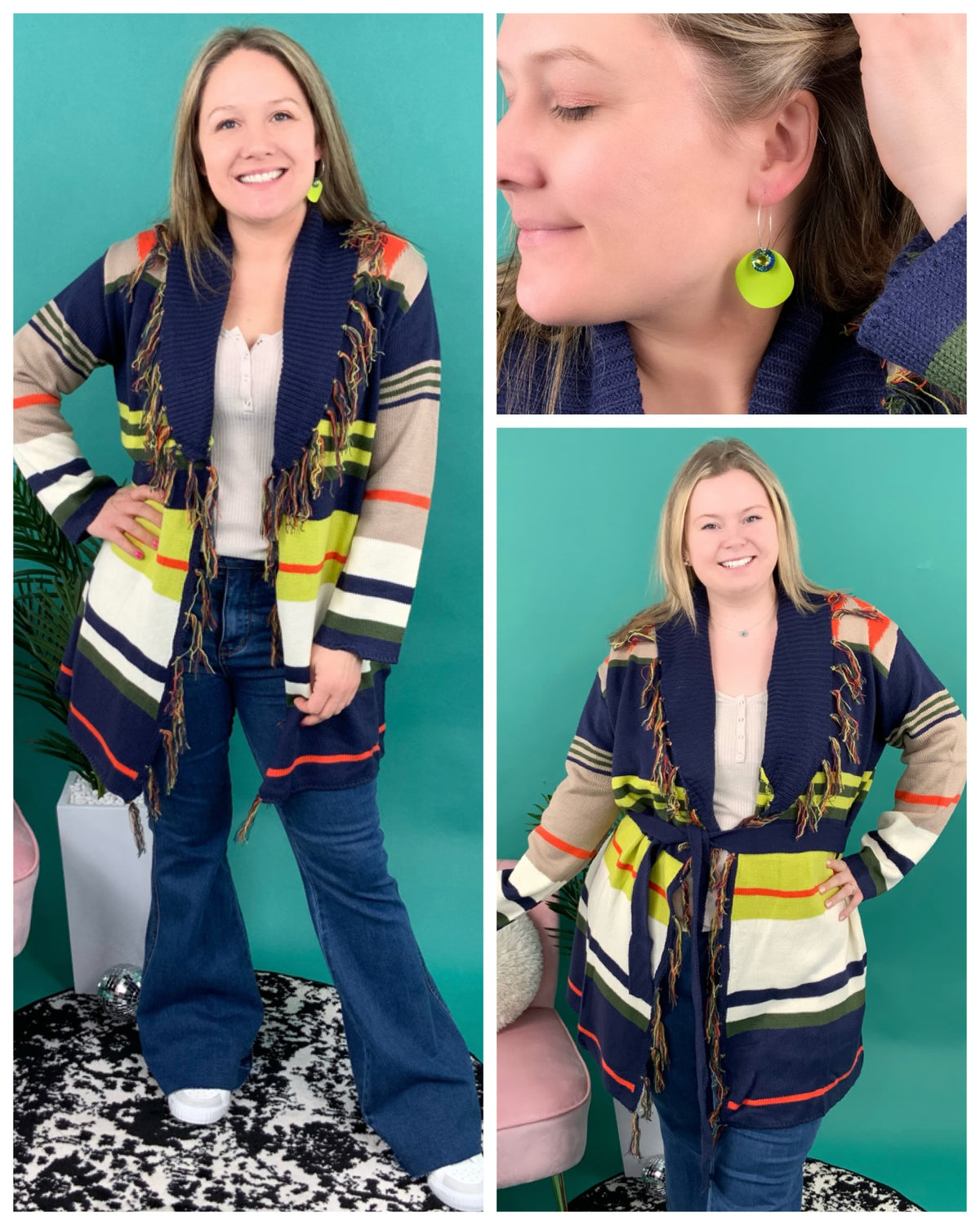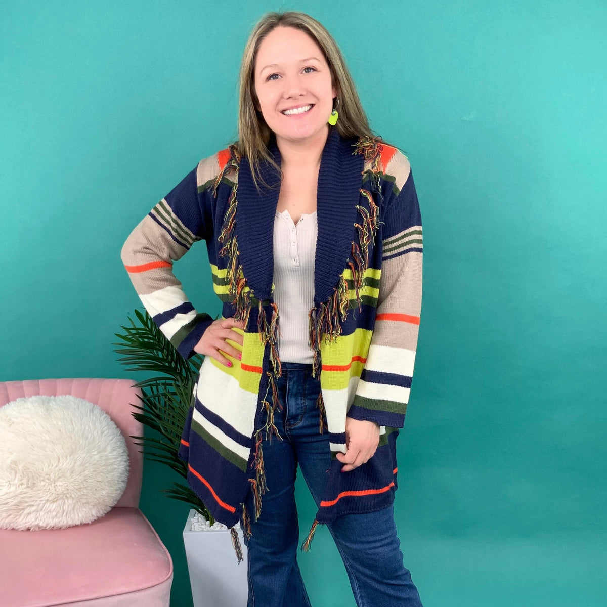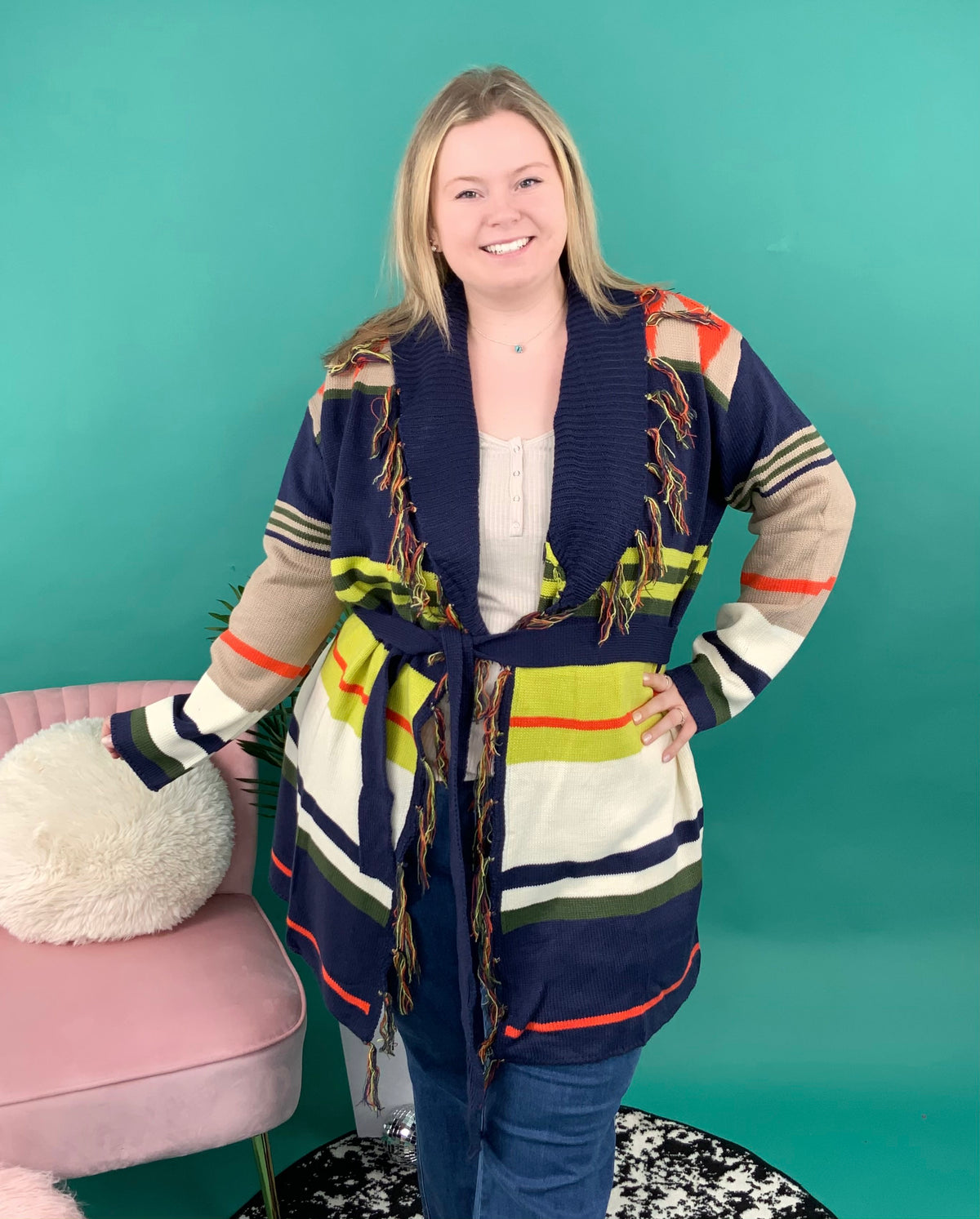 Your wardrobe will be instantly upgraded the moment you click "add to cart" on this cardigan! It features a unique striped design, long sleeves, fringe edges, and removable waist tie. Put this on over a solid turtleneck and jeans.