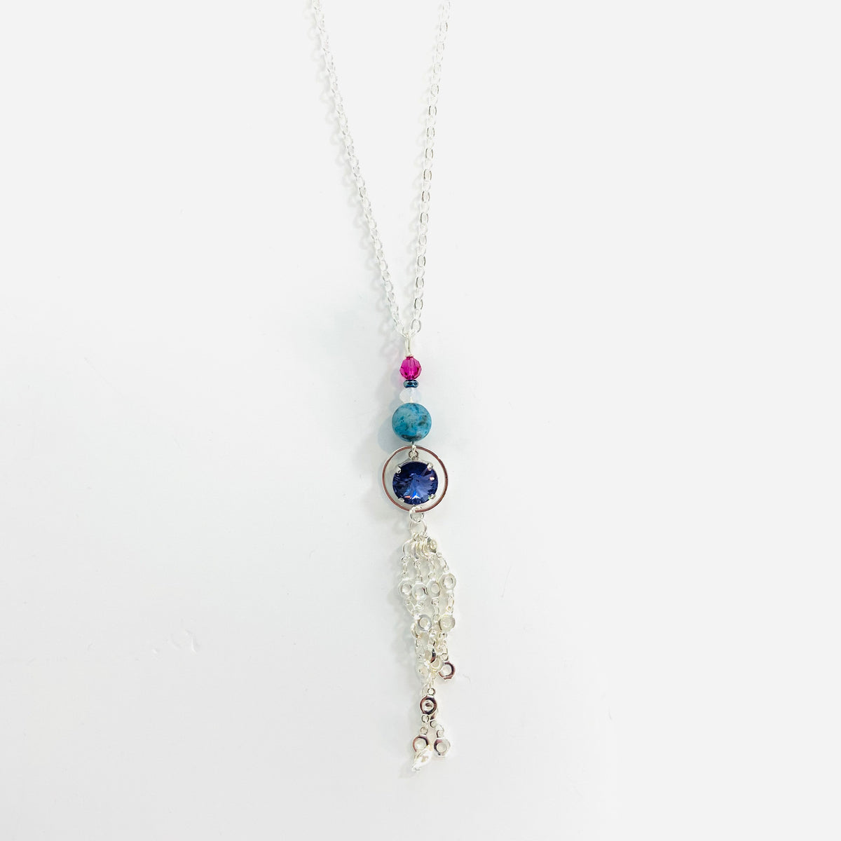 Long Charm Necklace with Floating Tanzanite Crystal Pendant, Blue Stone, and Fuchsia and White Opal Crystals