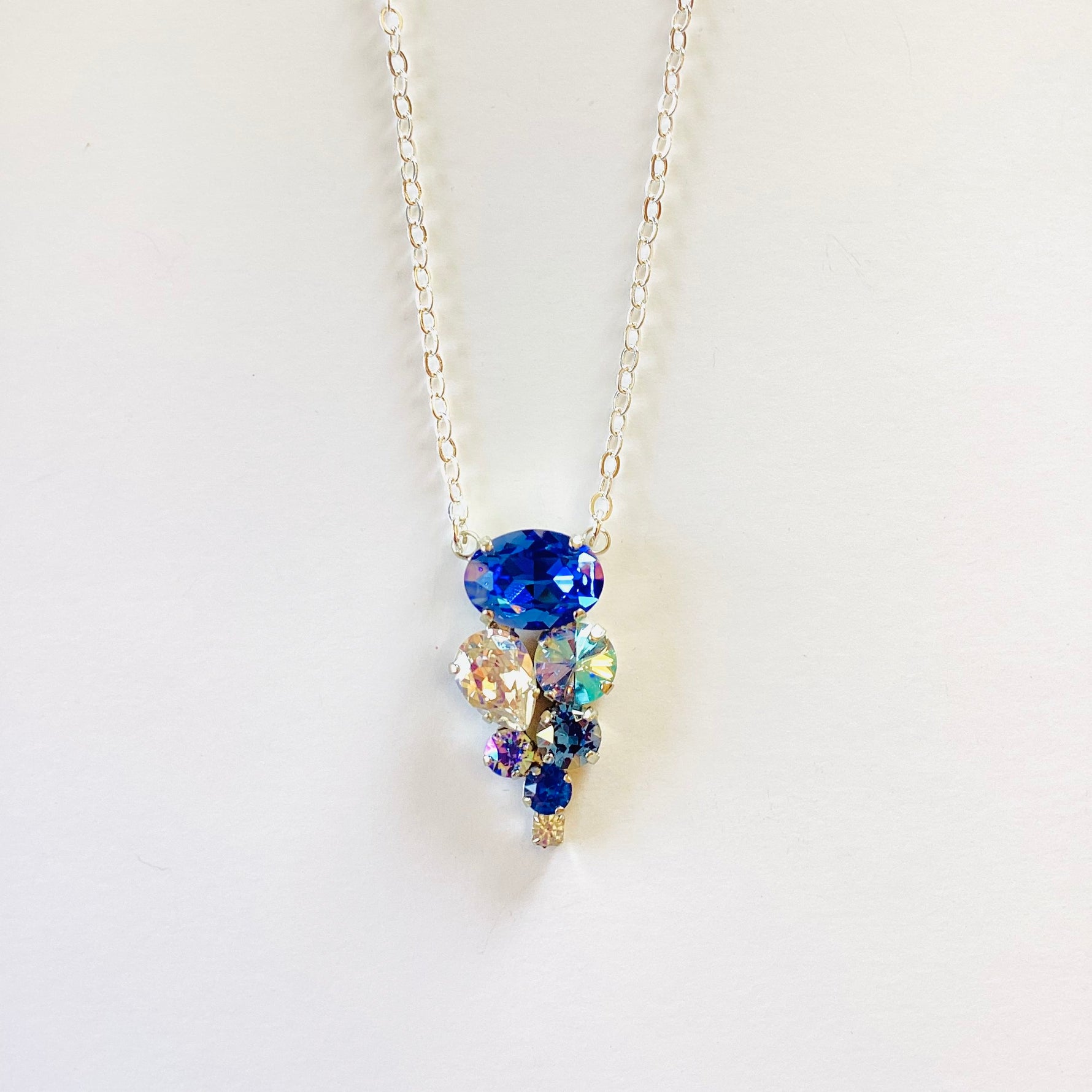 Long Cluster Necklace in Sapphire Champagne set into Shiny Silver Metal with Sapphire, Moonlight, Light Sapphire Shimmer, Light Sapphire AB, Royal DeLite, and Crystal