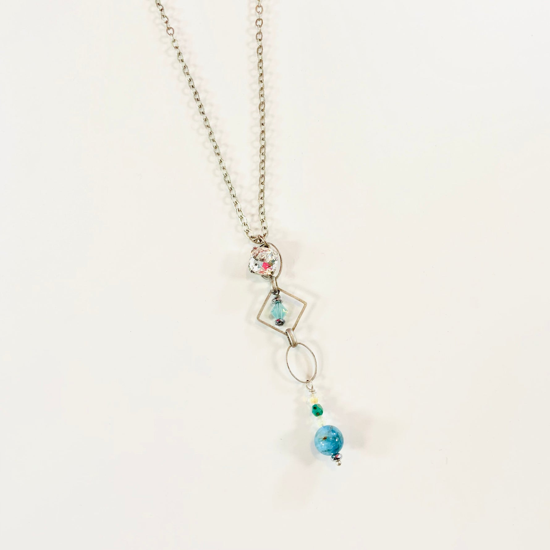 Long Minty Chain Link Necklace - Set into Antique Silver Metal with Crystal, Mint, Pacific Opal, Chrome