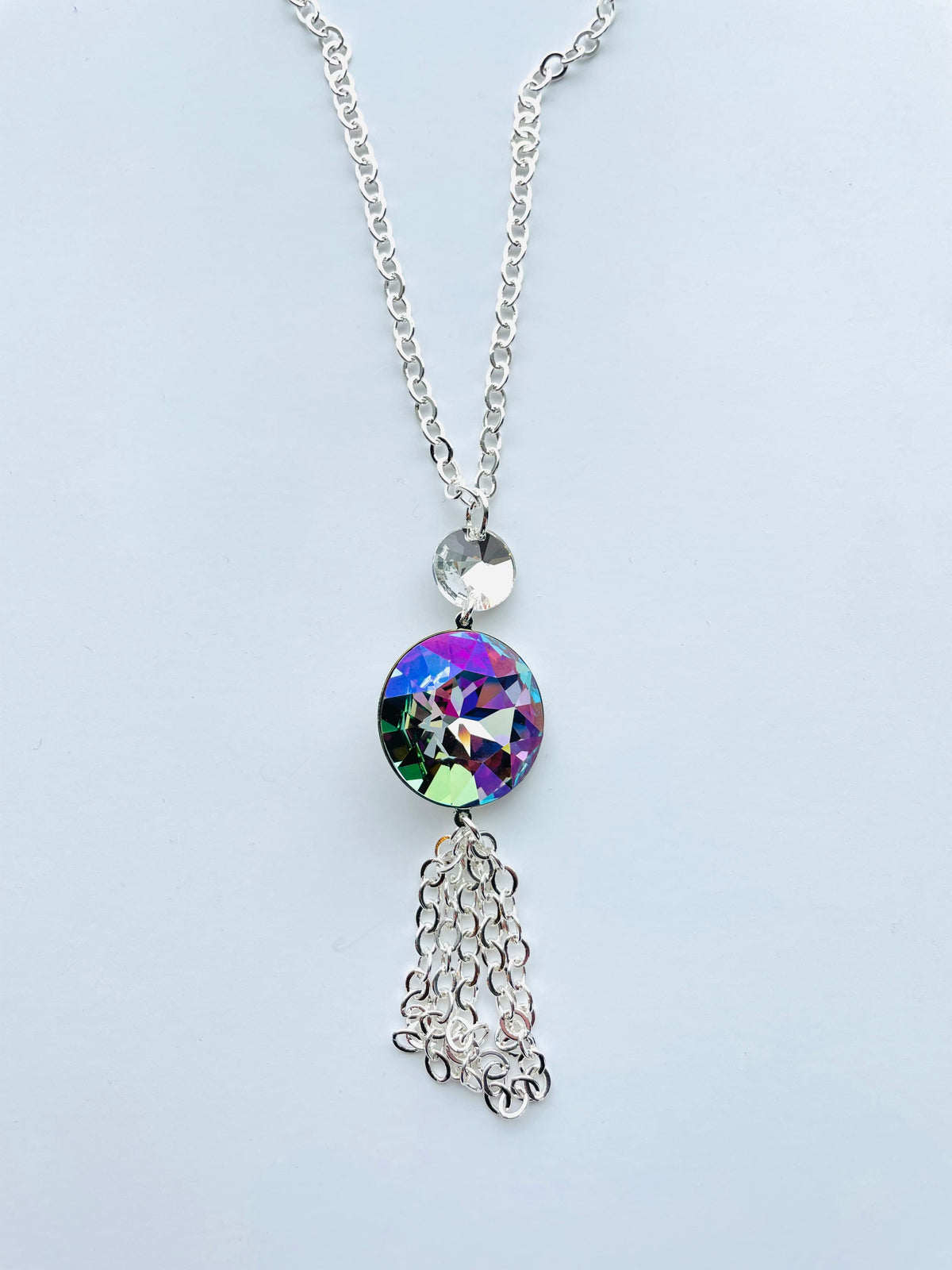 Long Tassel Statement Necklace in Iris set into Shiny Silver Metal