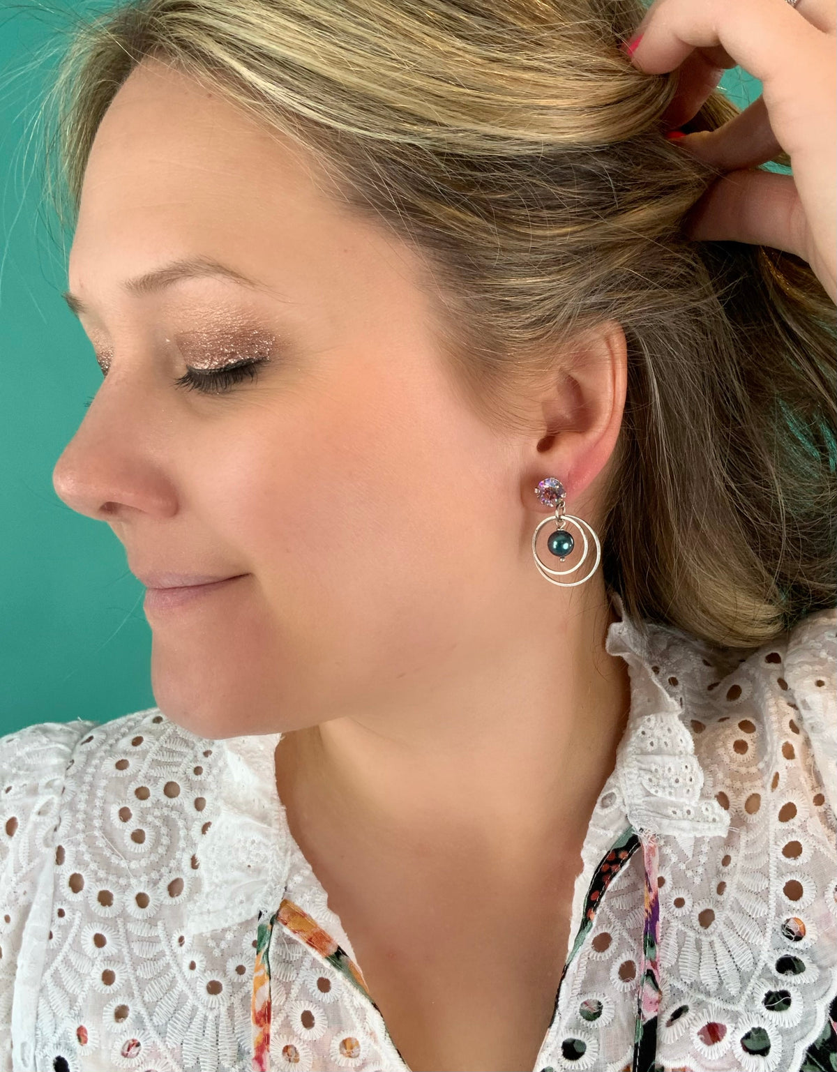 Love Song Earrings set into Antique Silver Metal with Tahitian Pearl and Silk Glacier Blue Crystals