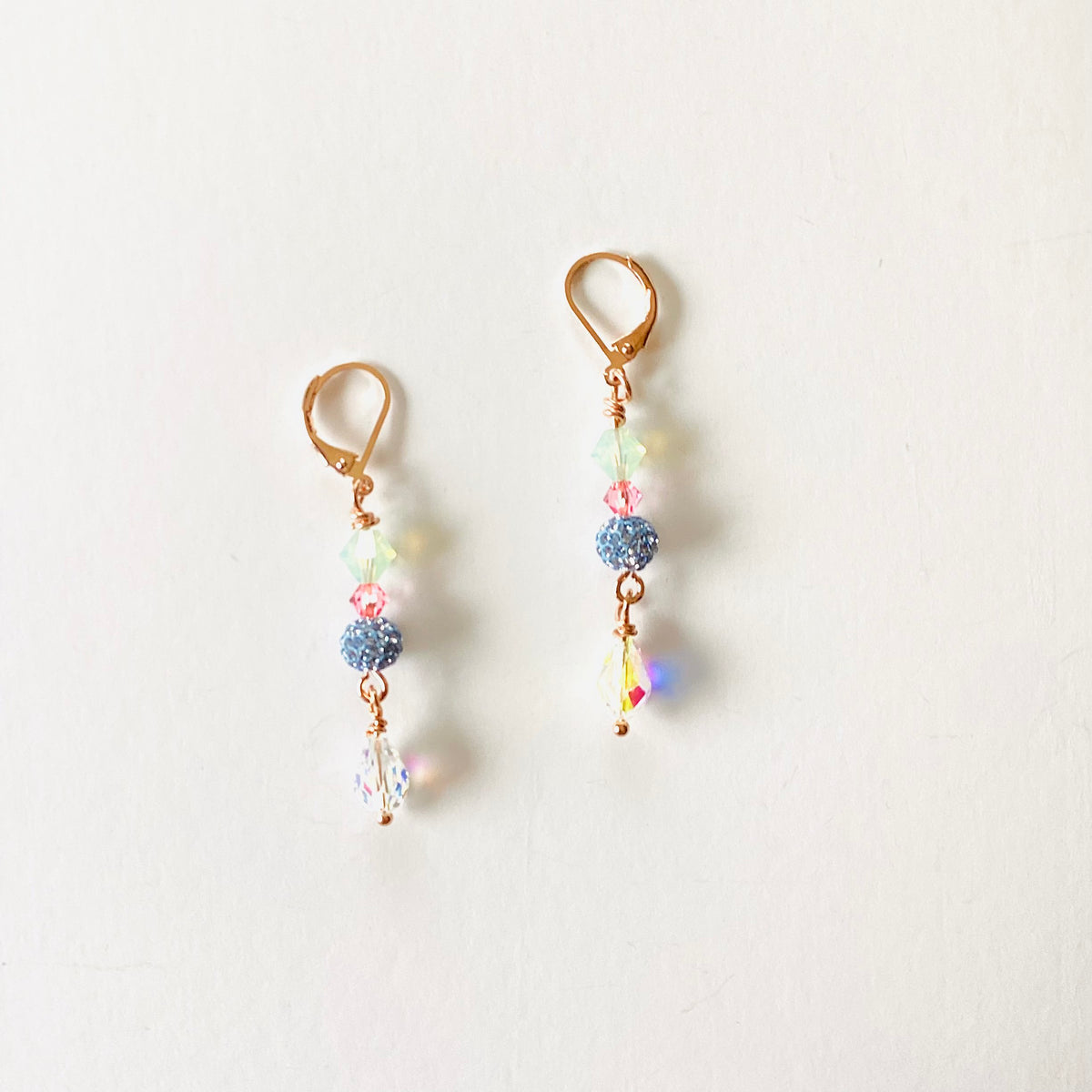 Magical Pastel Simple Drop Earrings set into Rose Gold Metal. Pacific Opal, Rose, Aqua Pave Beads, and Crystal AB.
