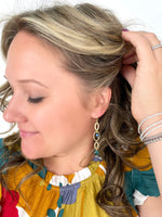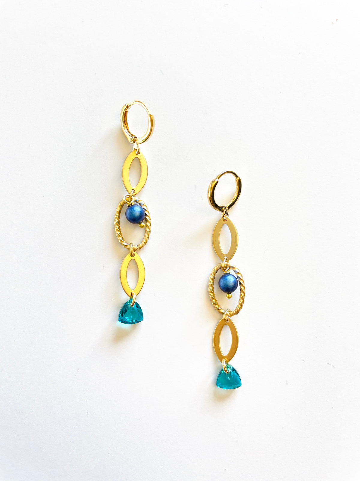 Majestic Teal Earrings set into Shiny Gold Metal with Blue Zircon Crystals and Iridescent Dark Blue Pearls.