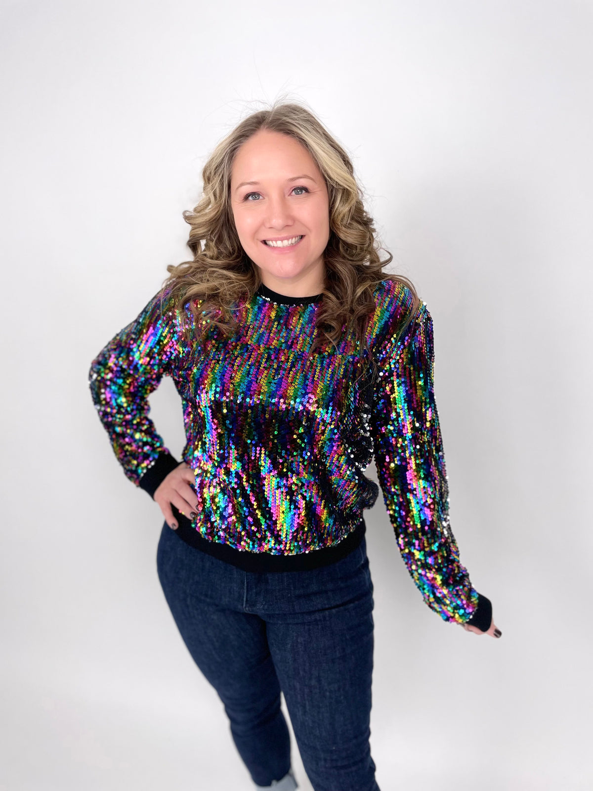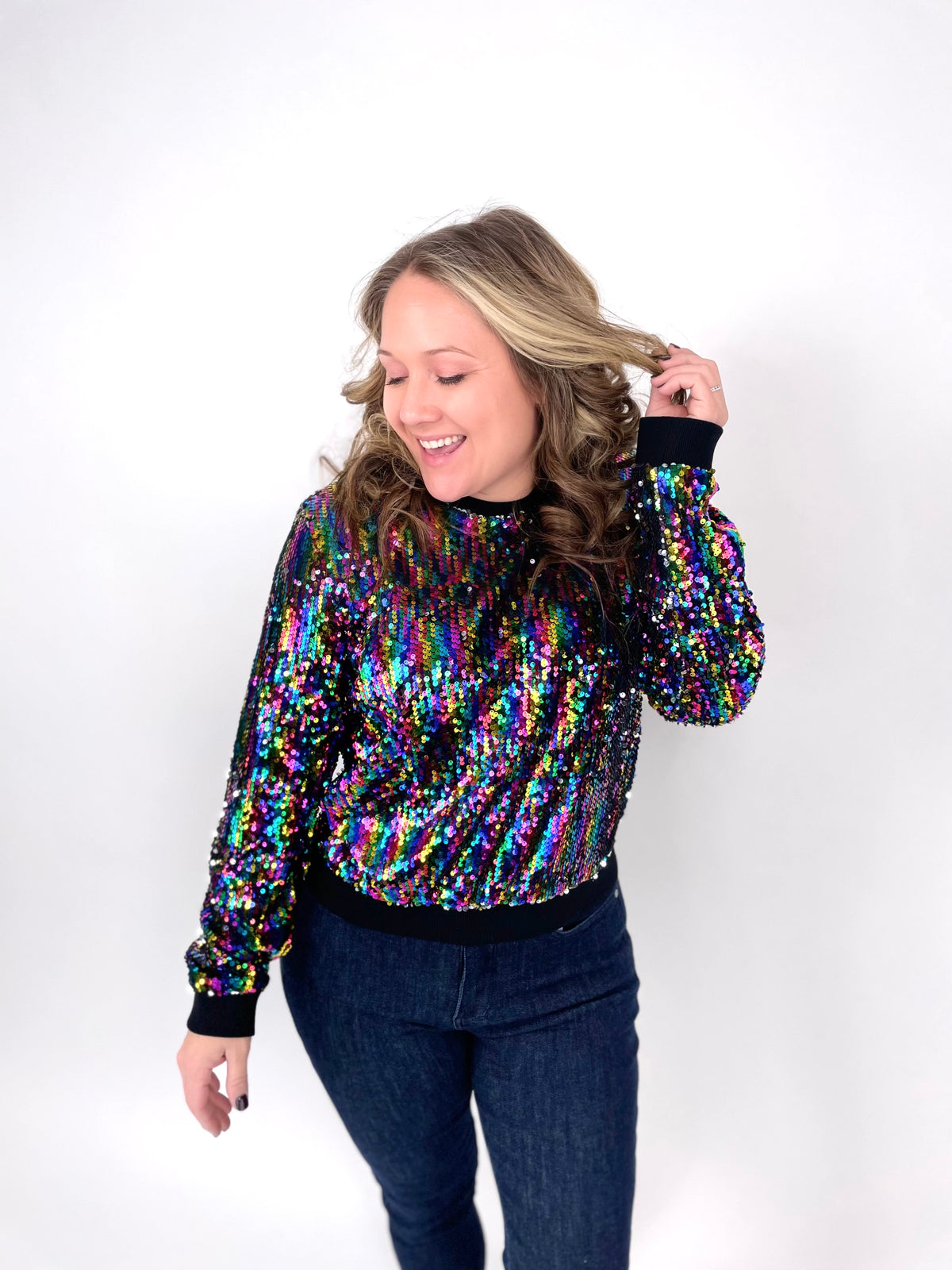 Live life on the edge with this beautifully crafted sequin pullover top! This top is perfect for when you want to light up the room. Features include long sleeves, elastic cuffs, and a colorful sequin design. Show off your glam style for holiday festivities, a fancy occasion, or a fun night out!