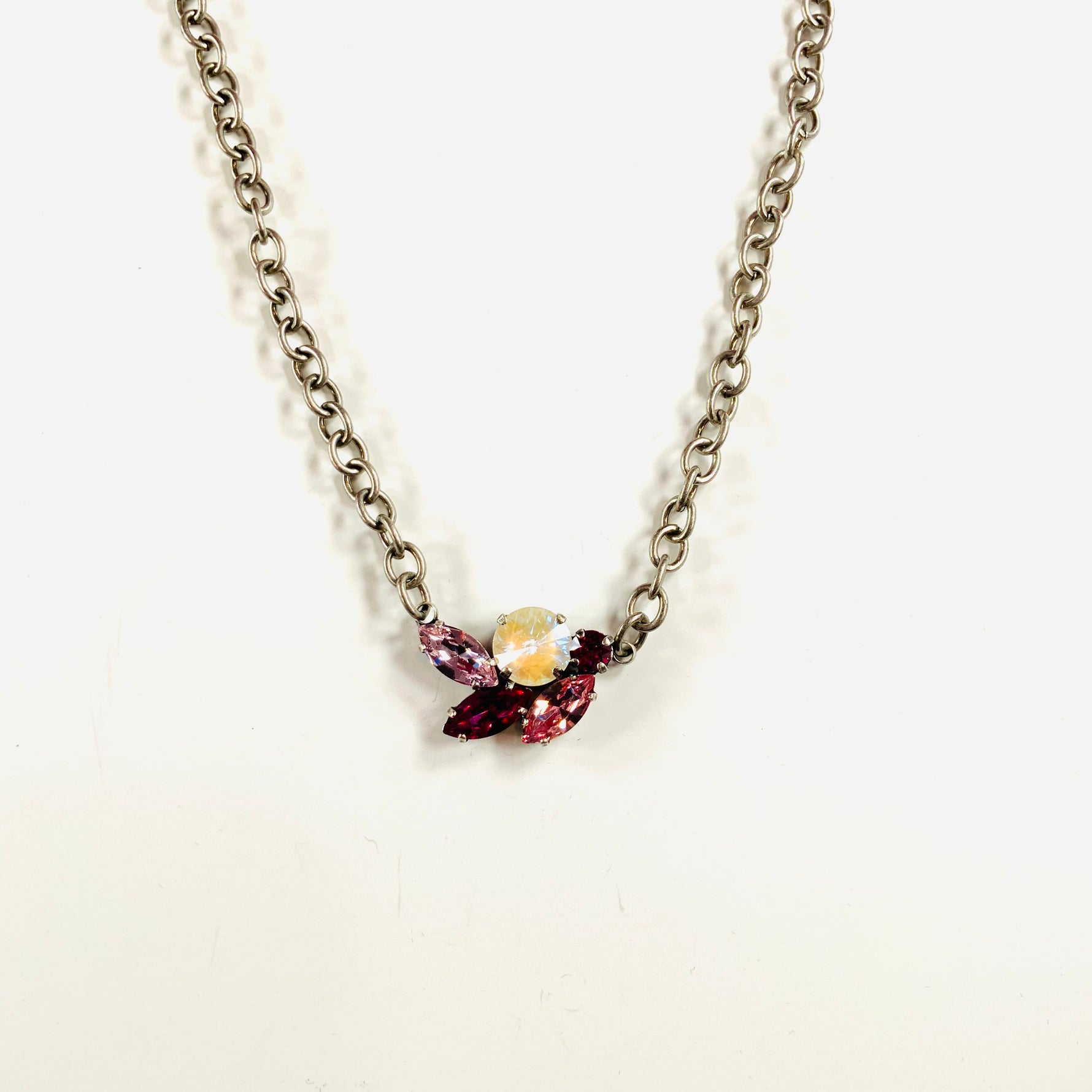 Marquise Feather Necklace set into Antique Silver Metal with pops of White DeLite, Rose, Light Rose,