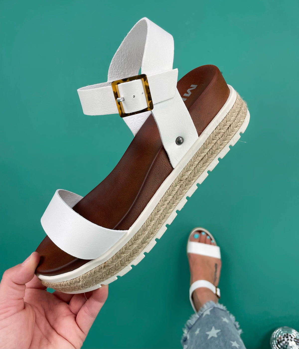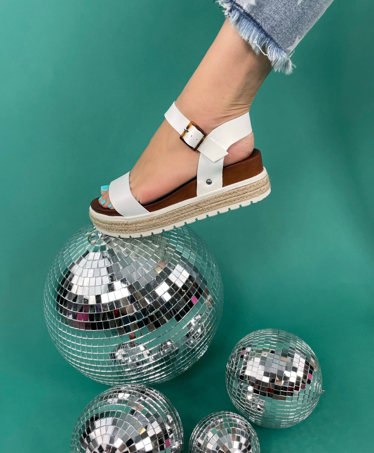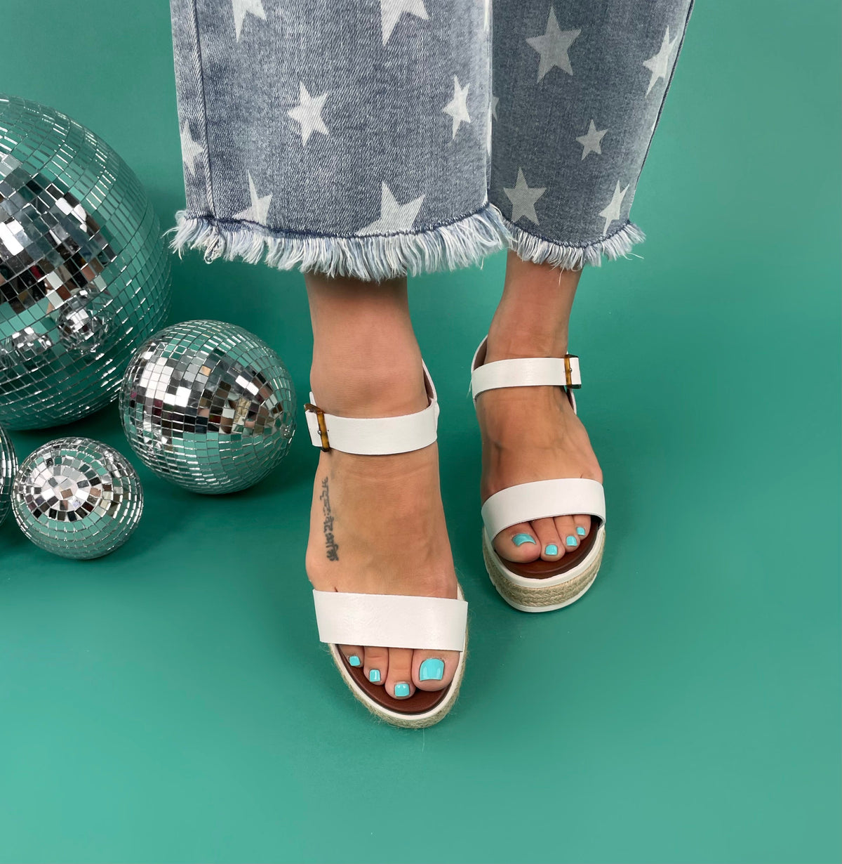 Step into style with the KIERA. This platform sandal is crafted with a vegan leather upper with a single strap and buckle ankle closure. Finished with an anatomically contoured footbed and espadrille-inspired raffia sole.