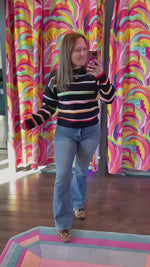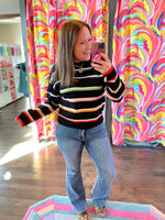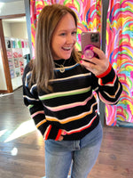 Rock the rainbow with this playful Midnight Rainbow Sweater! Made of cozy striped knit, the black background and colorful stripes add a touch of whimsy to any outfit. Stay warm and stylish, all while exuding a fun and carefree vibe. (Rainbows and sweaters, what's not to love?!)