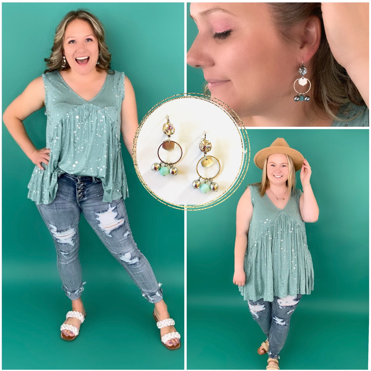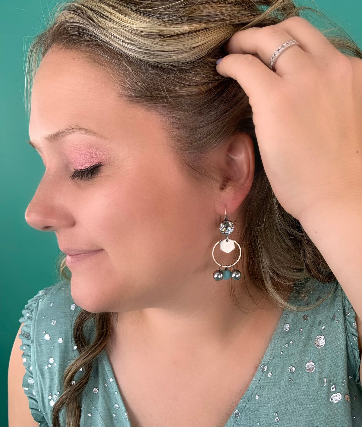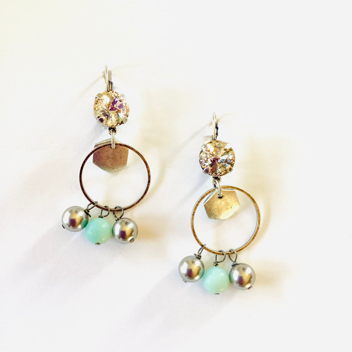 Minty Bling Earrings set into Antique Silver Metal with Silver Pearls, Mint Rocks, and Silver/Rose Gold Patina Crystals