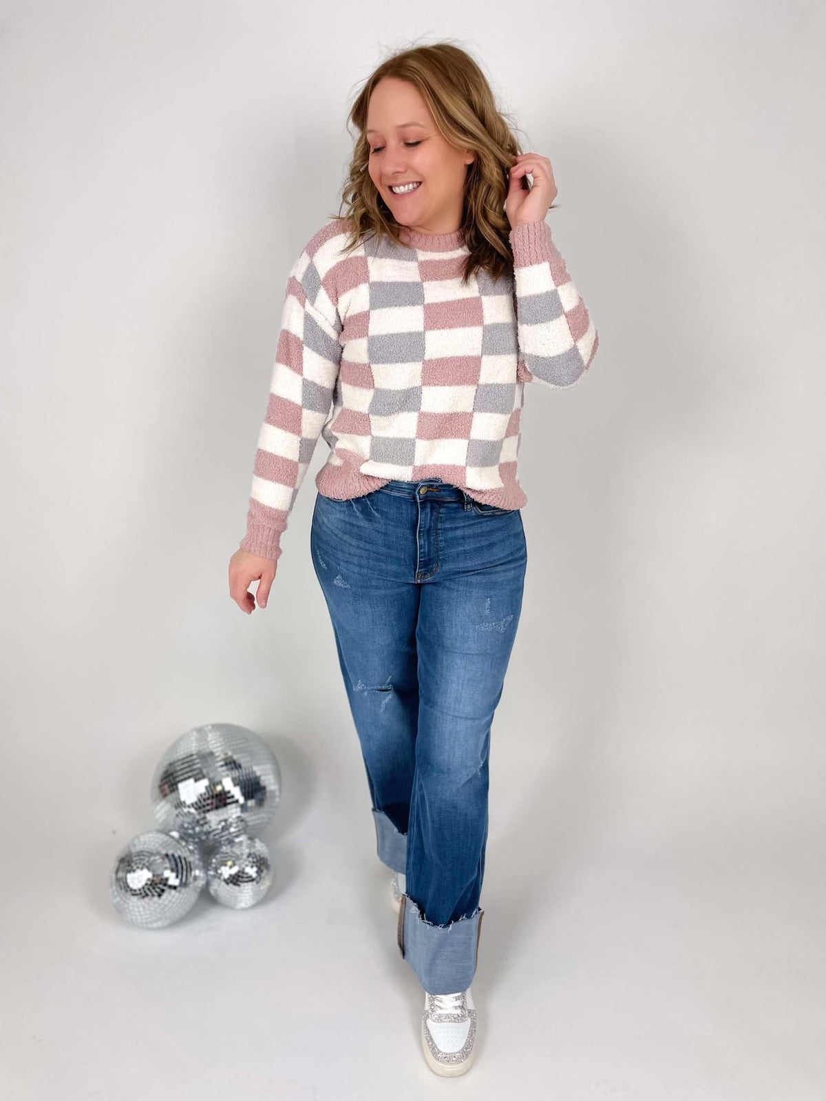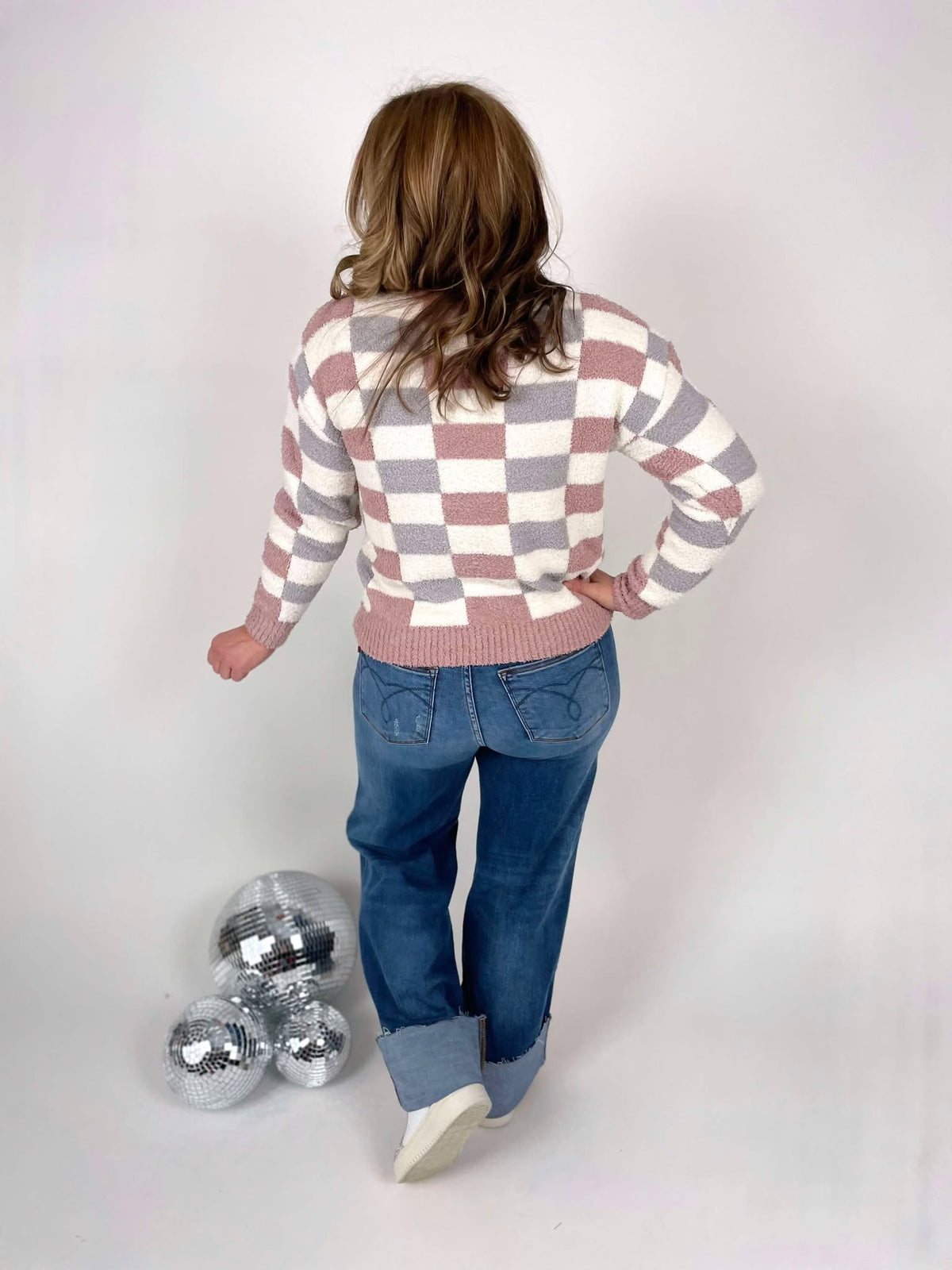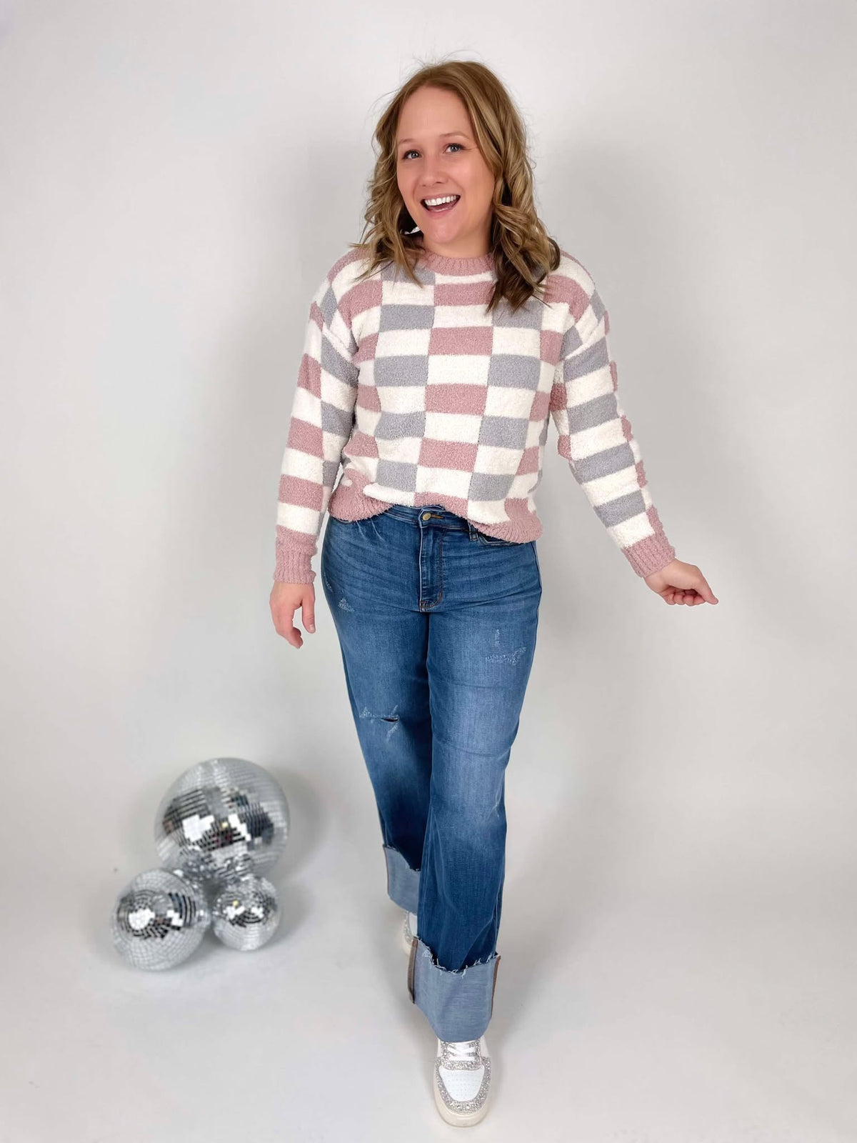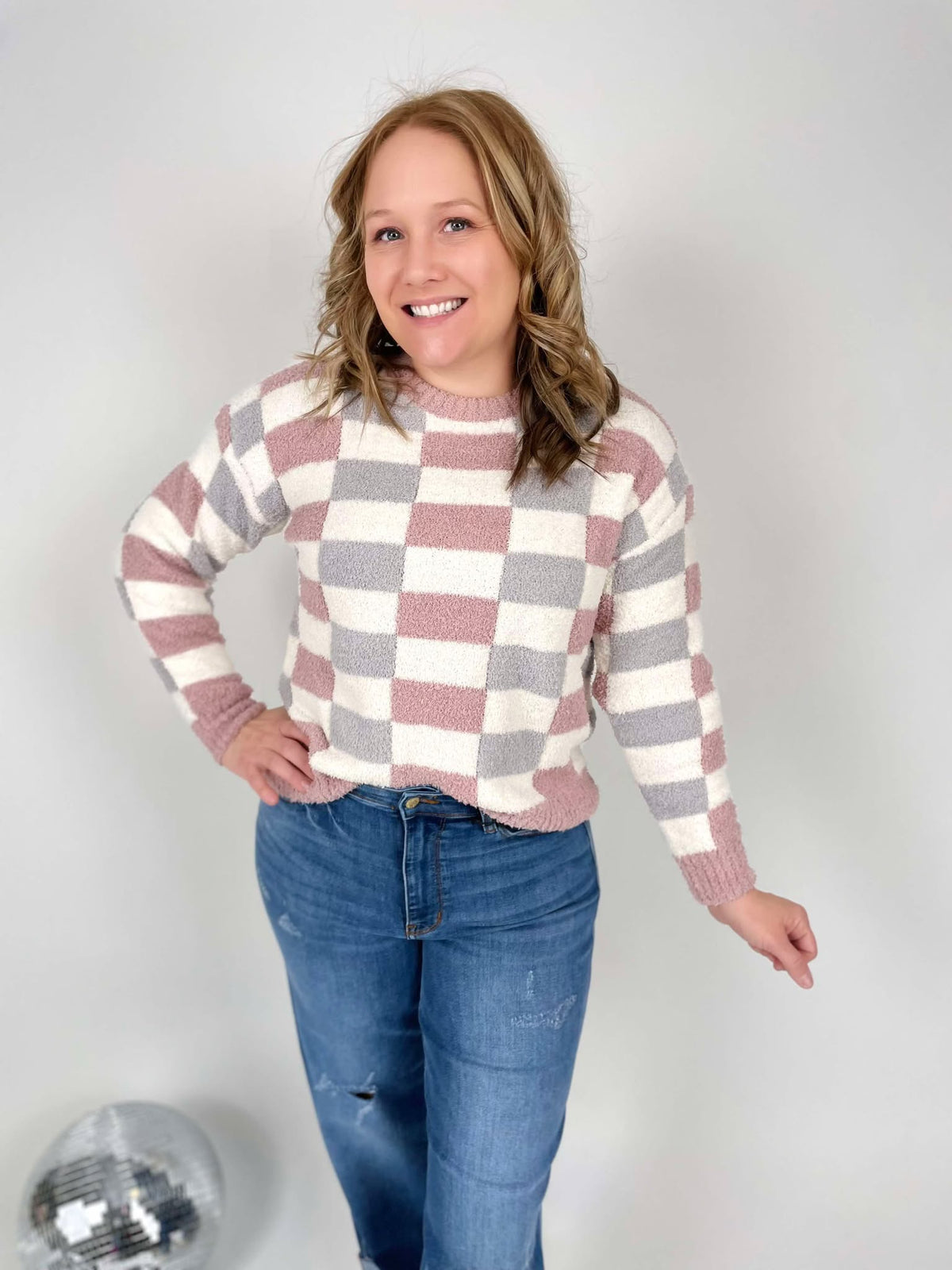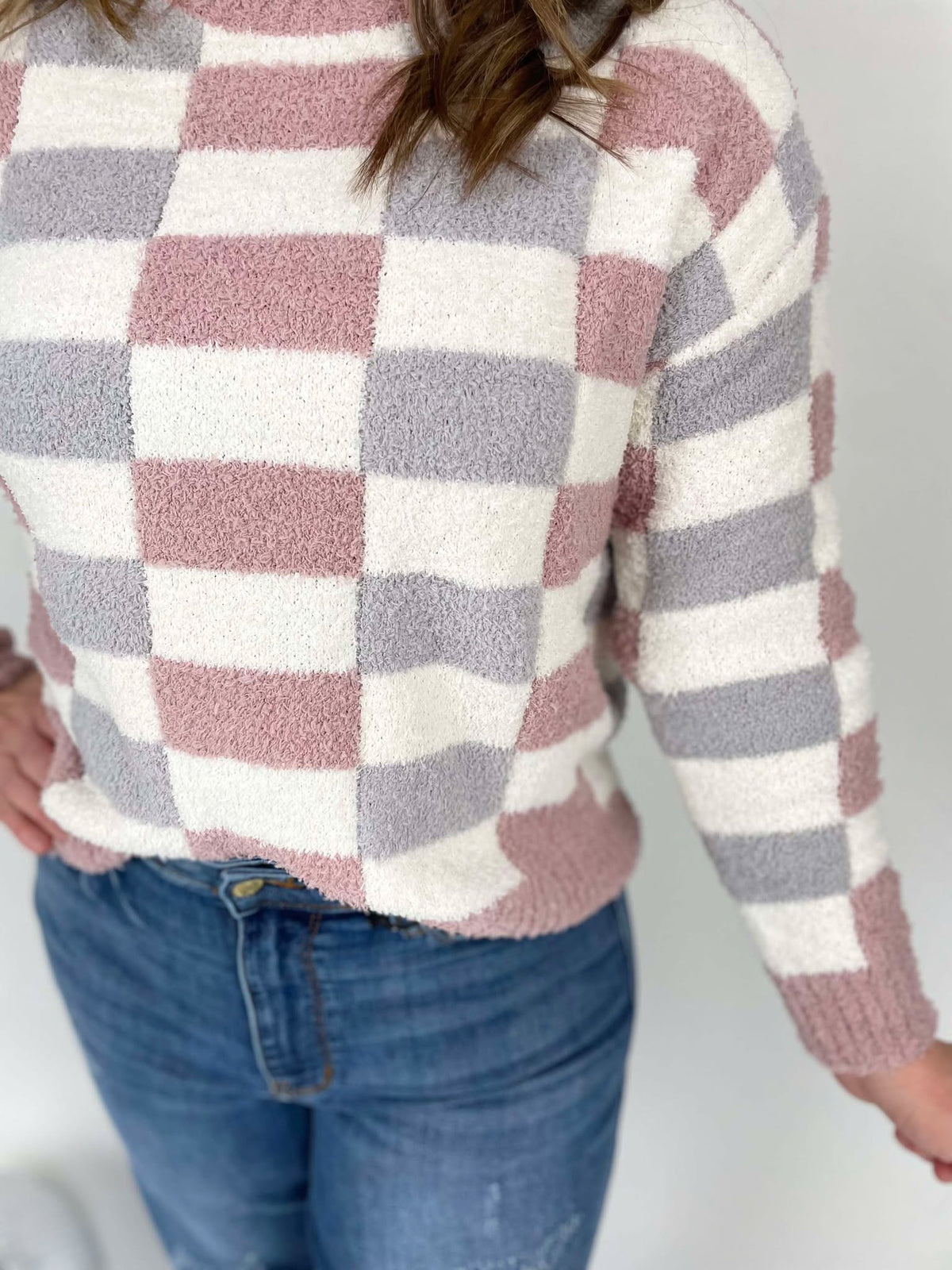 Feel cozy and stylish in our Checkered Sweater! Made with super soft material, this grey and pink sweater is perfect for any occasion. Its checkered pattern adds a fun touch to your outfit, making you feel happy and comfortable all day long.