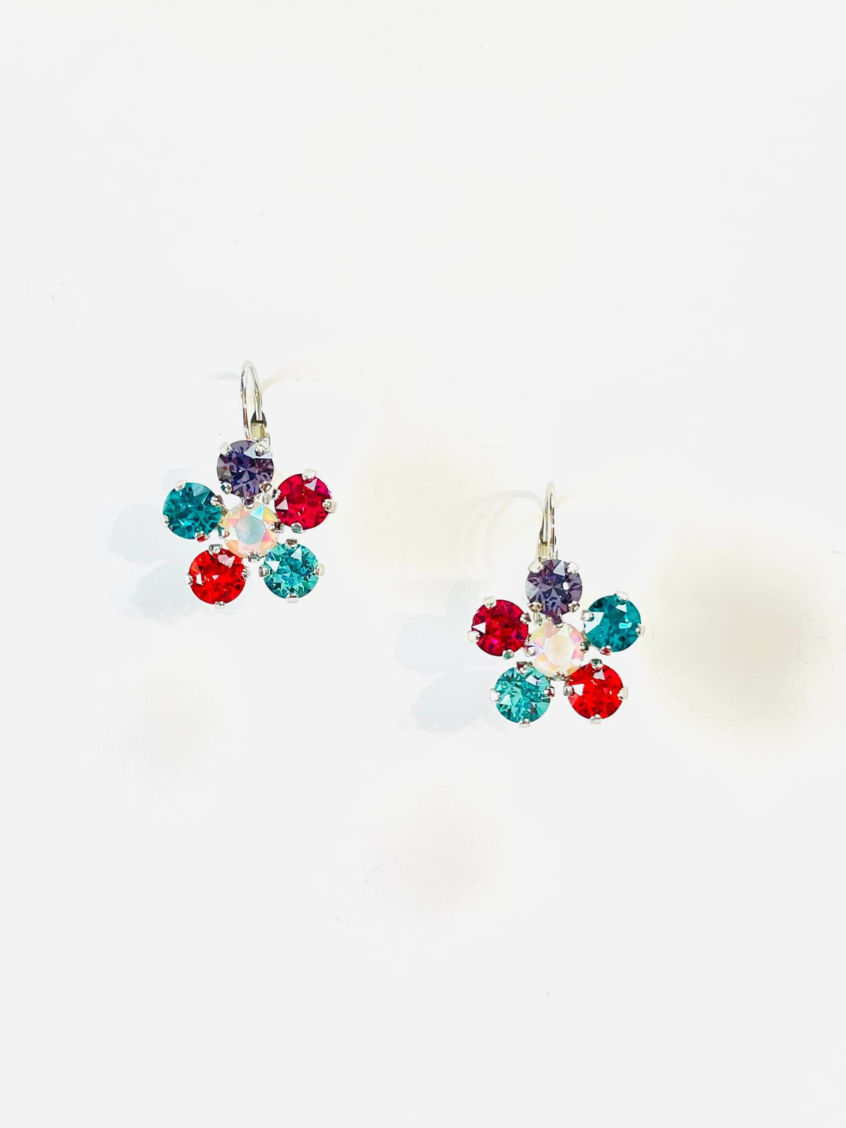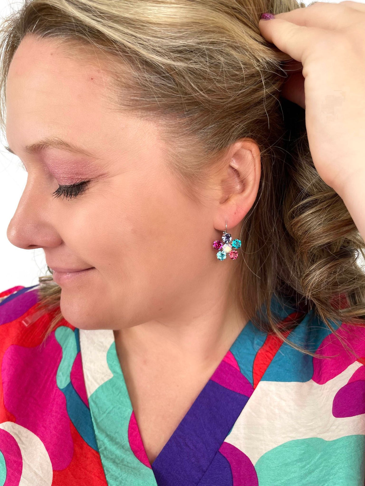 Mod Floral Earrings set into Silver Plated Metal with Blue Zircon, Indian Pink, Tanzanite, Fuchsia, Light Turquoise, and Ultra White Ignite AB.