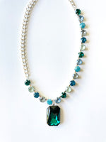 Mystical Creature Asymmetric Diamonds Necklace set into Shiny Silver Metal with Emerald Ignite, Agave Ignite, Montana Ice, Dark Grey Ignite, Teal Ice, Denim Blue Ignite. Large Emerald Crystal Pendant.