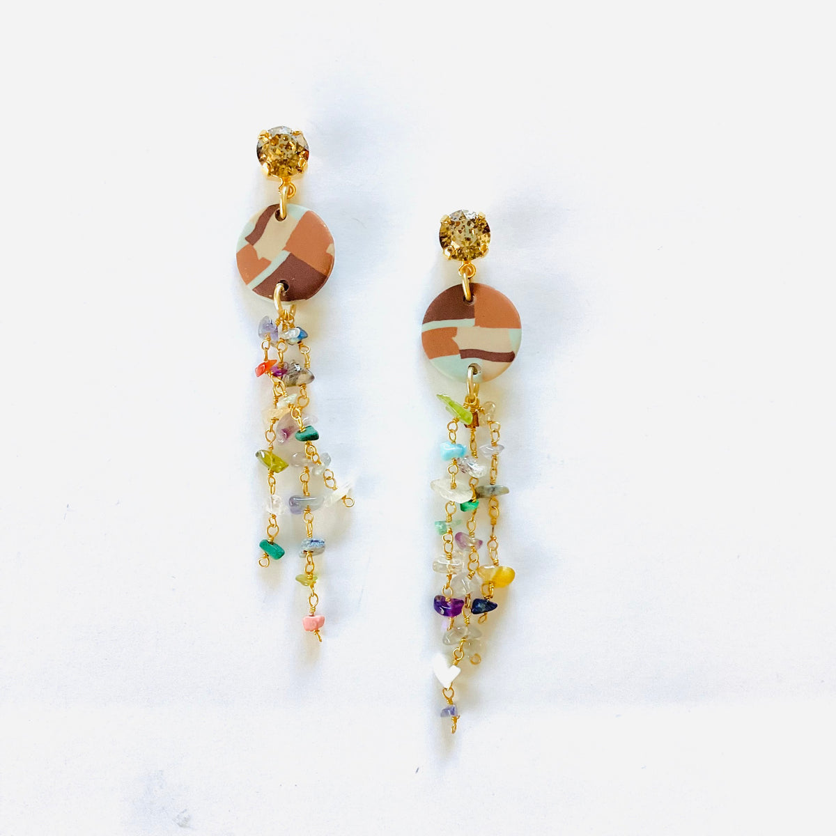 Natural Multi-Colored Chain Fringe Earrings set into Gold Plated Metal.