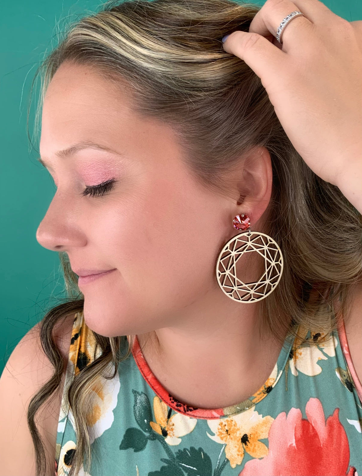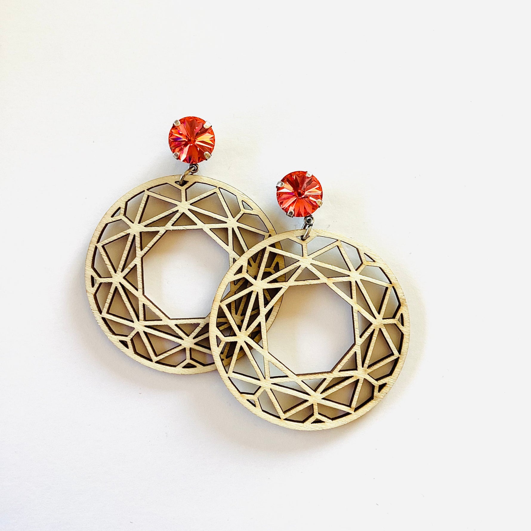 Natural Wood Coral Earrings set into Antique Silver Metal with Natural Laser Cut Wood Pendant and Padparadscha Crystals