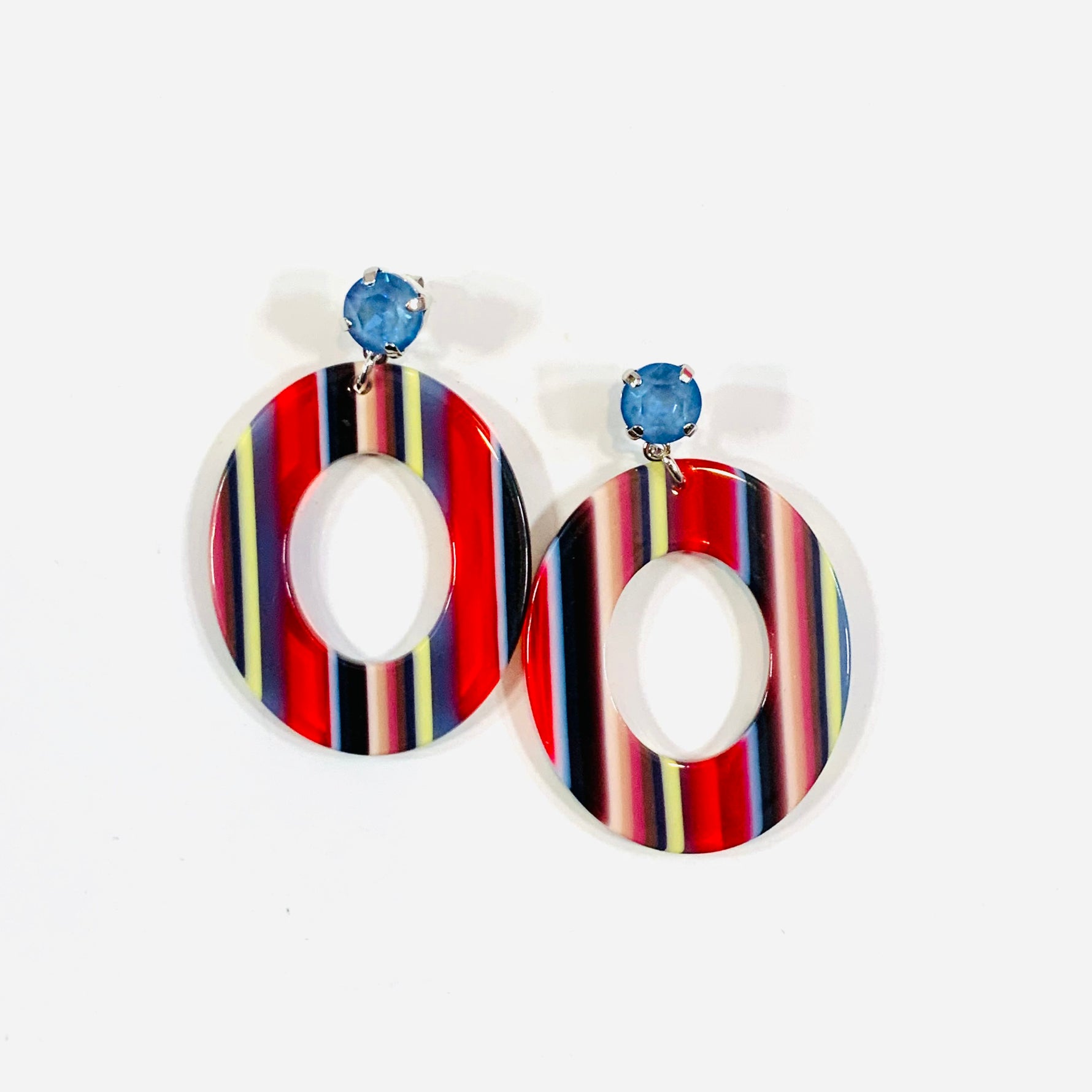Navy Pinstripe Earrings set into Shiny Silver Metal with Ocean Blue DeLite Crystal