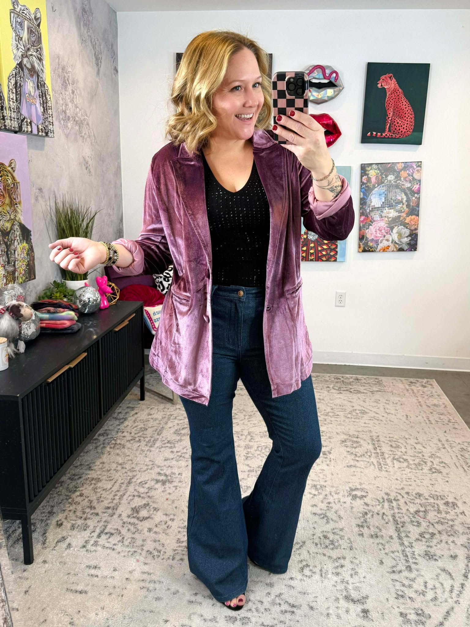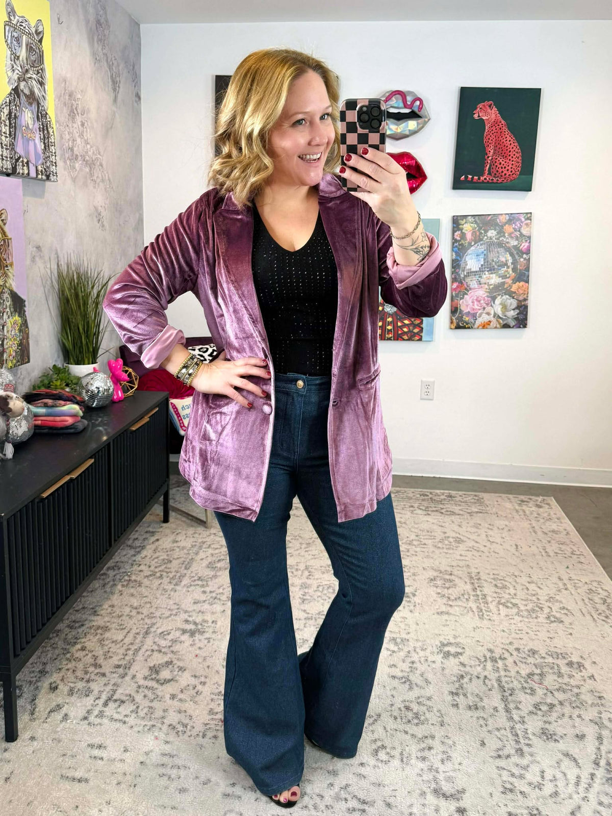 This velvet blazer is soft and comfortable! Is definitely a statement piece that you cant go wrong with! An easy way to dress up any outfit. Features front working buttons, side pockets and lined with a stretchy soft fabric. The jacket itself also has stretch.