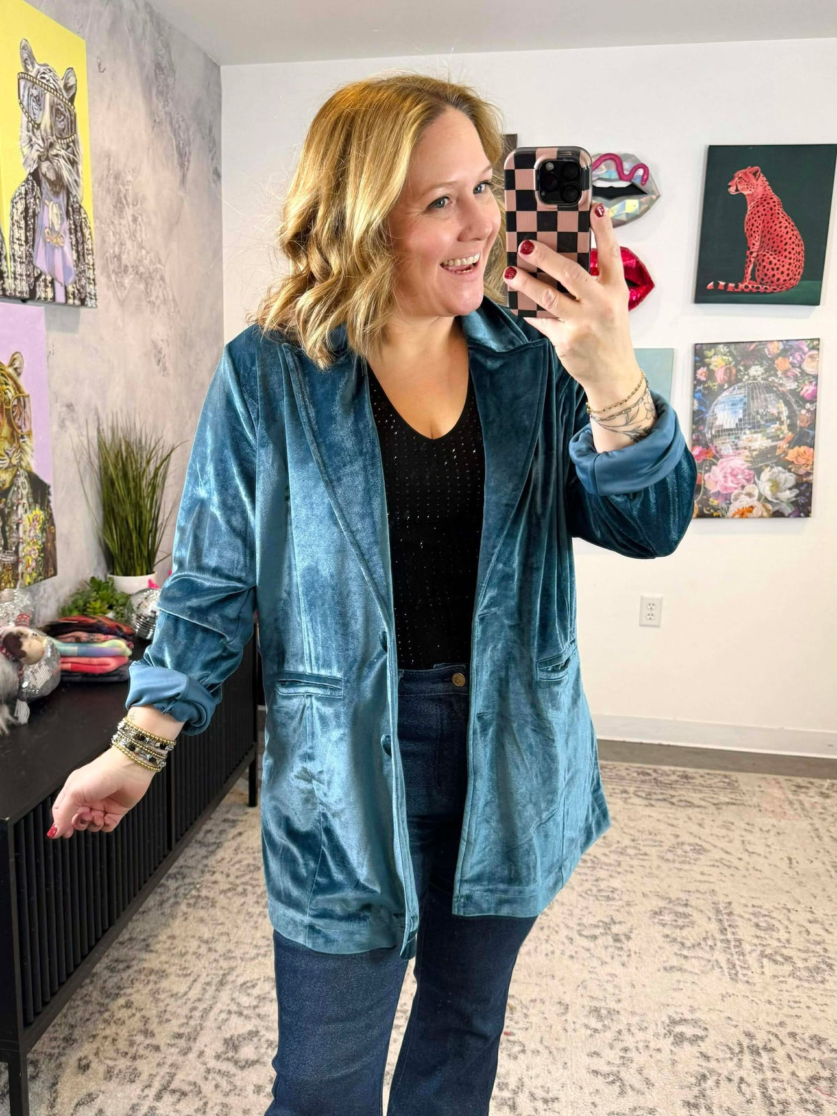 This velvet blazer is soft and comfortable! Is definitely a statement piece that you cant go wrong with! An easy way to dress up any outfit. Features front working buttons, side pockets and lined with a stretchy soft fabric. The jacket itself also has stretch.