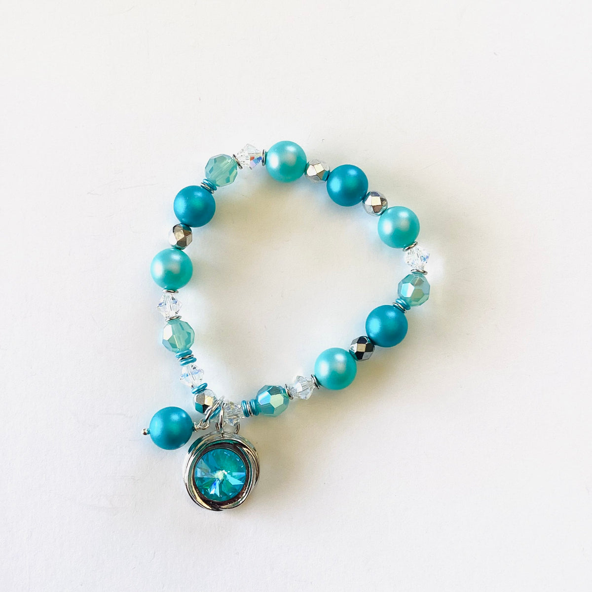 Crystals in Laguna, Pacific Opal AB, and Crystal AB. Pearls in Iridescent Dark + Light Turquoise