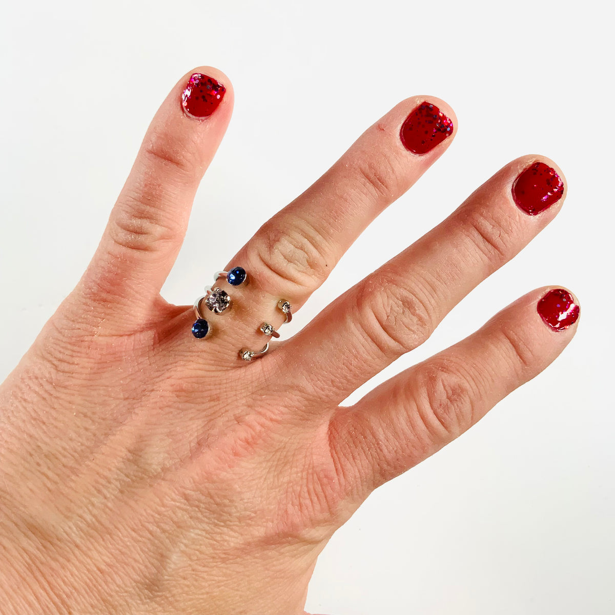 Off Balance Ring in Purple Shades set into Shiny Silver Metal with pops of Tanzanite Smoky Mauve, and Crystal
