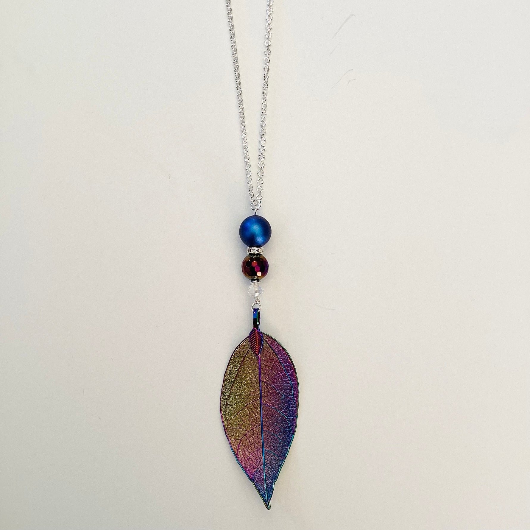 Oil Slick Leaf Necklace in Iridescent Blue Pearls and Oil Slick Fire Polished Bead.
