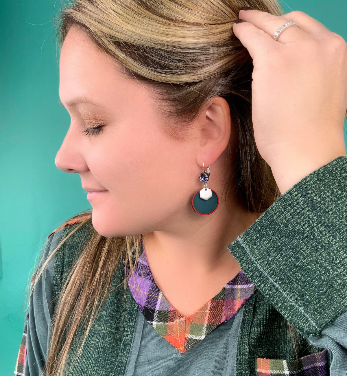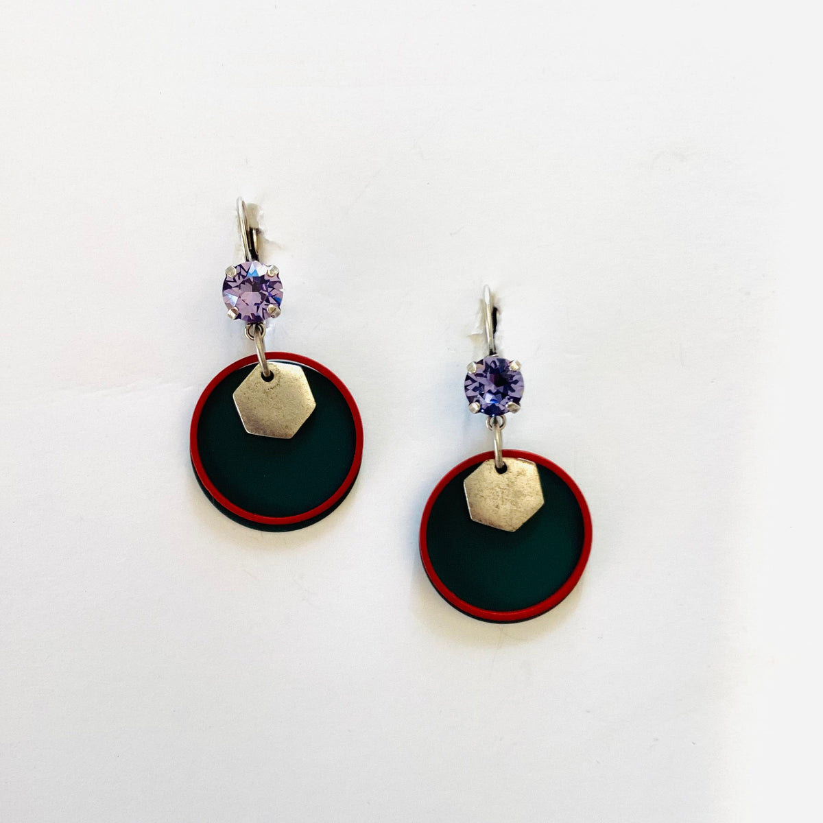 On the Edge Earrings set into Antique Silver Metal with Tanzanite Crystals, Red Matte Link, Dark Green Matte Link Charms