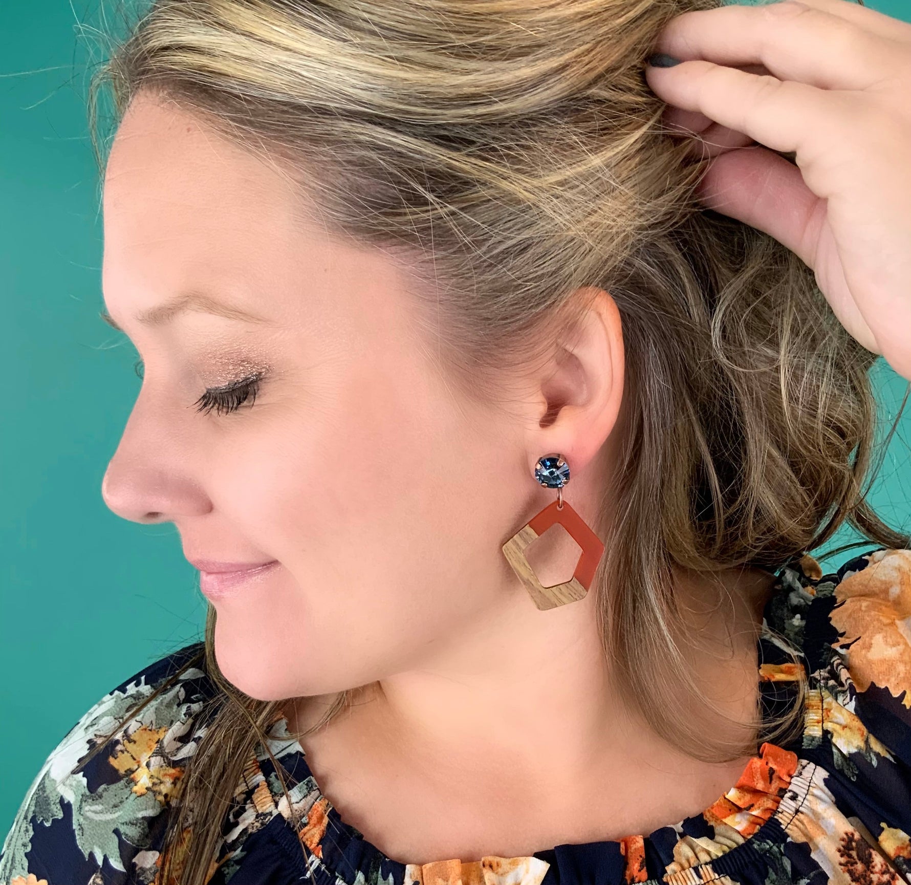 Orange Mahogany Wood Earrings set into Antique Copper Metal with Denim Blue Crystal and Lightweight Orange/Dark Wood Pendant