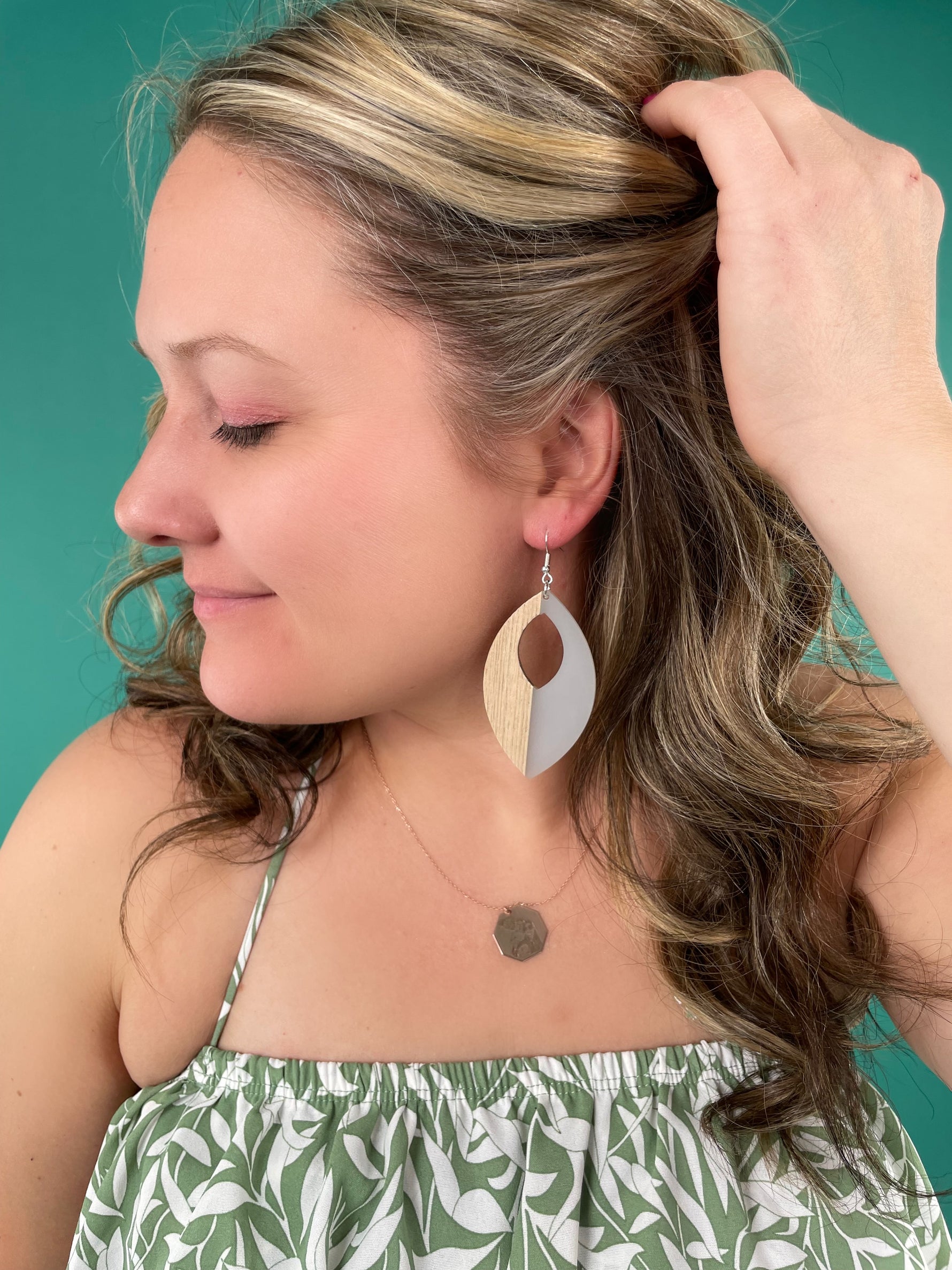 Palm Leaf Wood Earrings set into Shiny Silver Metal with Lightweight Wood Pendant.