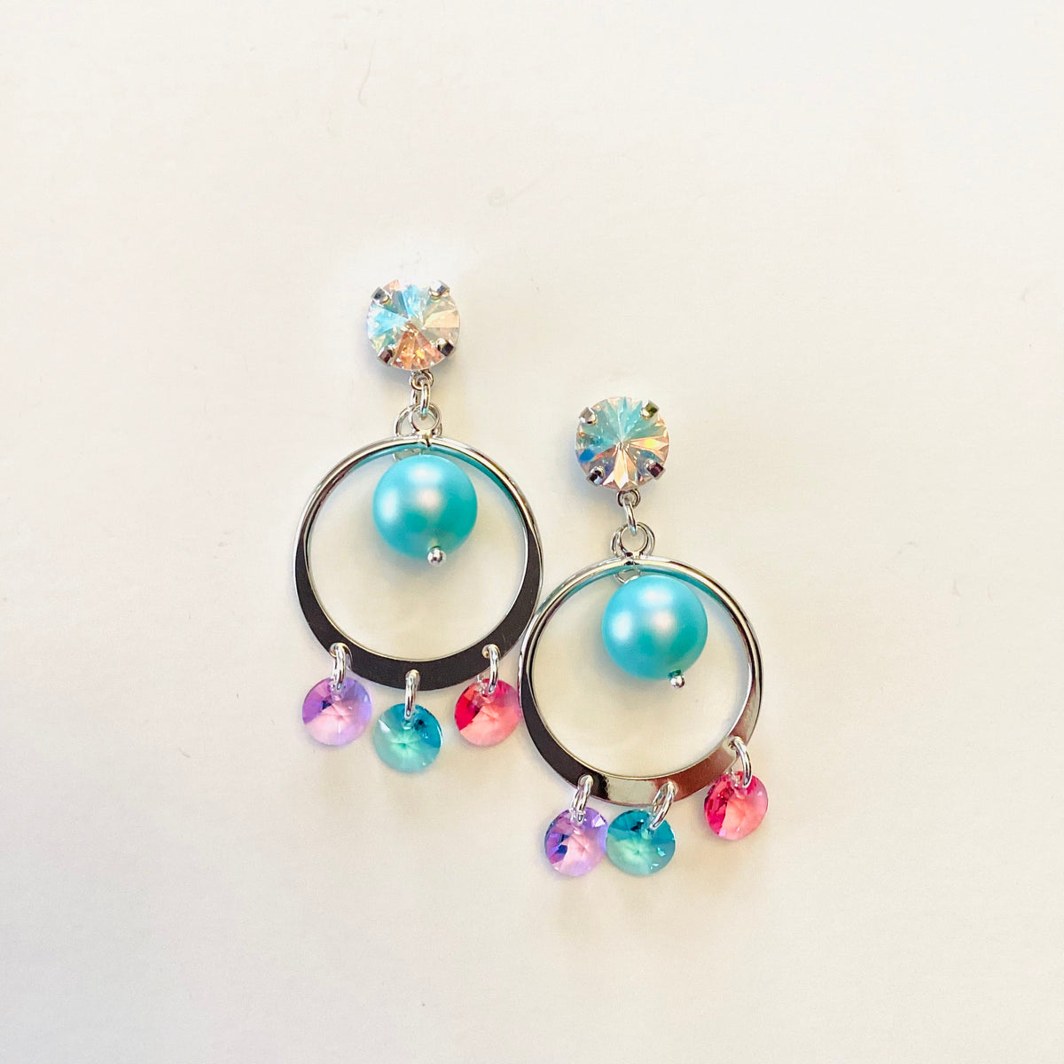Pastel Charm Hoop Earrings set into Shiny Silver Metal with Rose, Light Turquoise, and Violet and NEW Light Iridescent Blue Pearls. Crystal Shimmer Crystals.