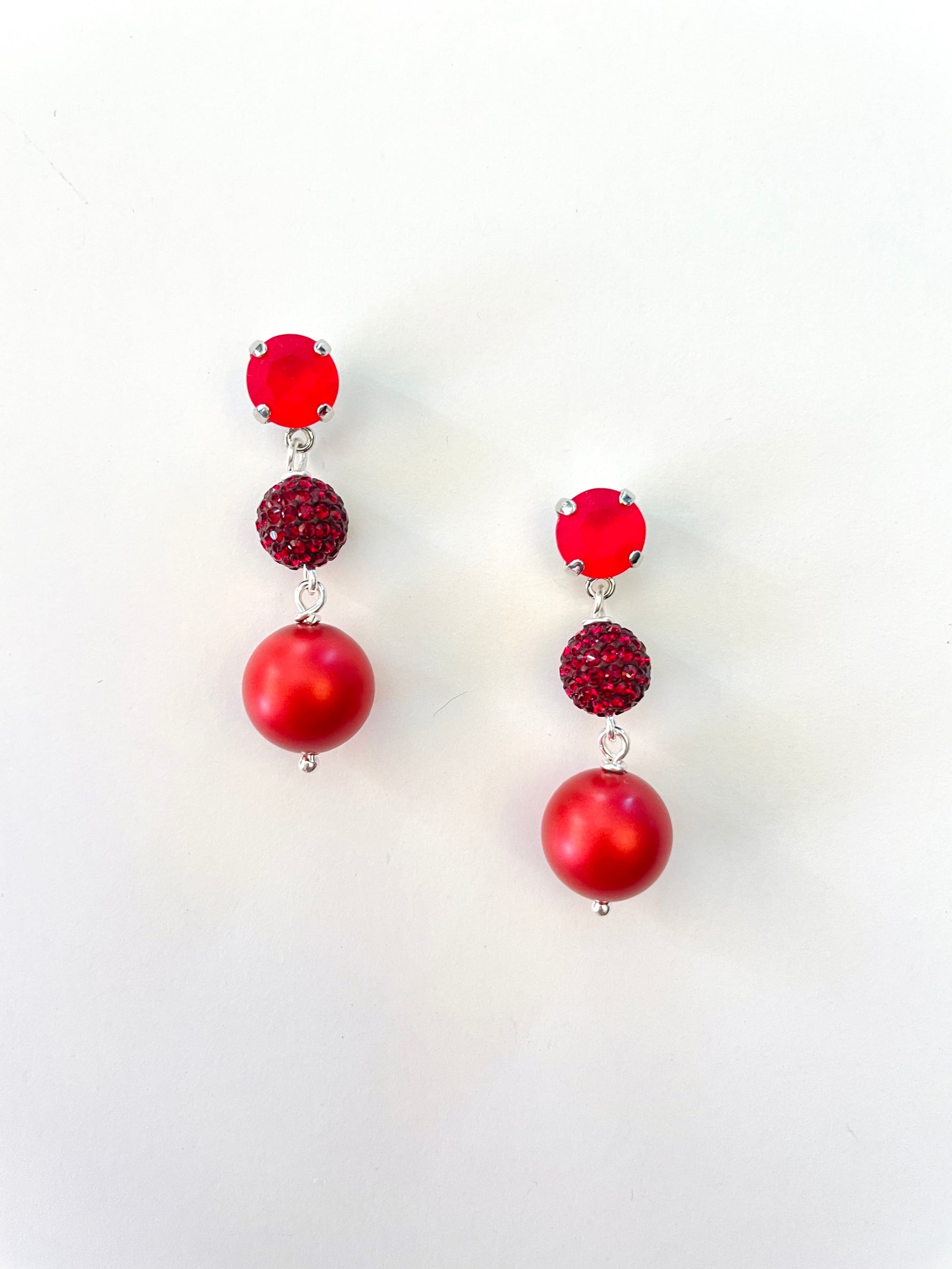 Pave Ball Drop Earrings in Red Hues set into Silver Plated Metal with Light Siam Matte, Siam Pave Ball Crystals and Rouge Pearls.