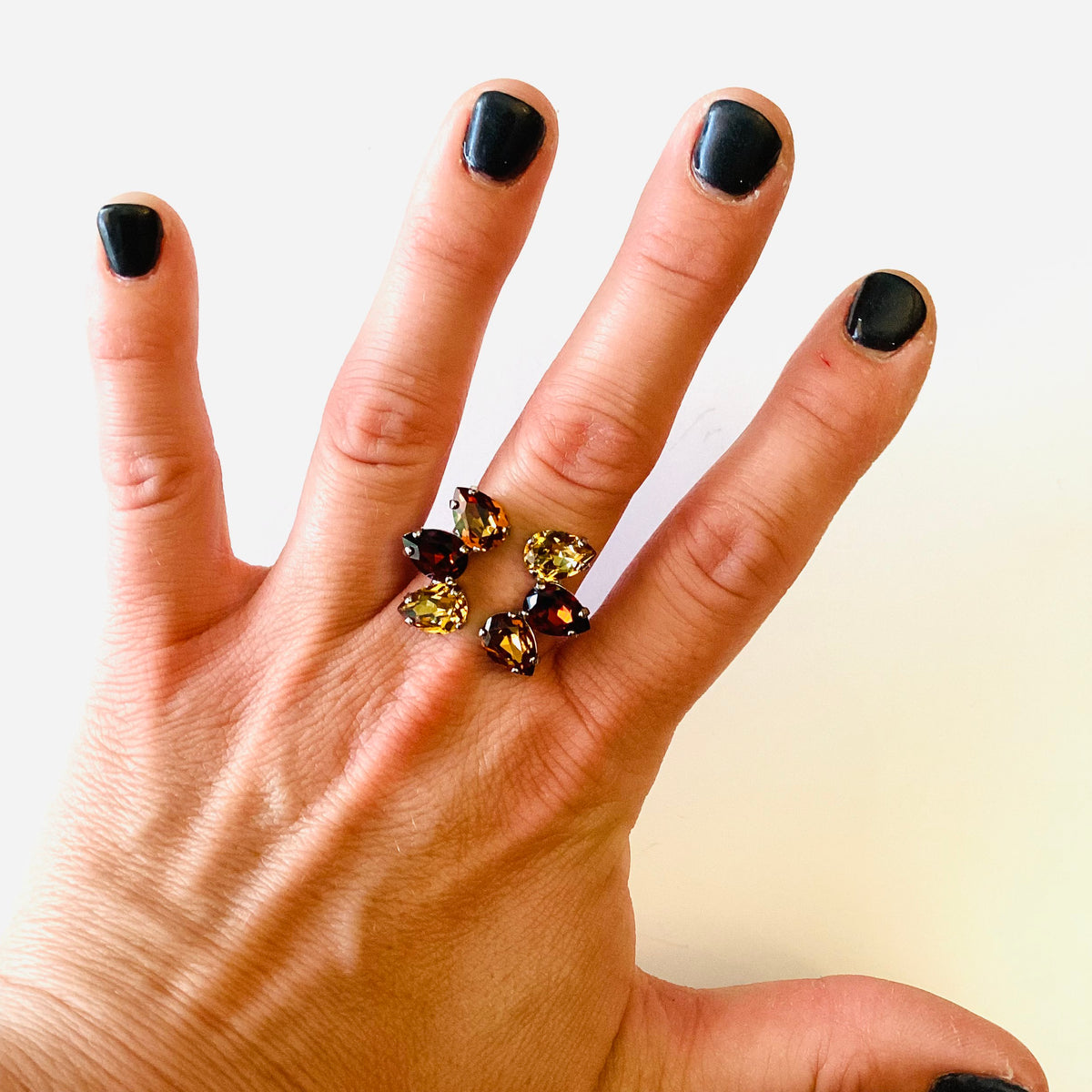 Pear Waterfall Ring in Fall Hues set into Shiny Silver Metal
