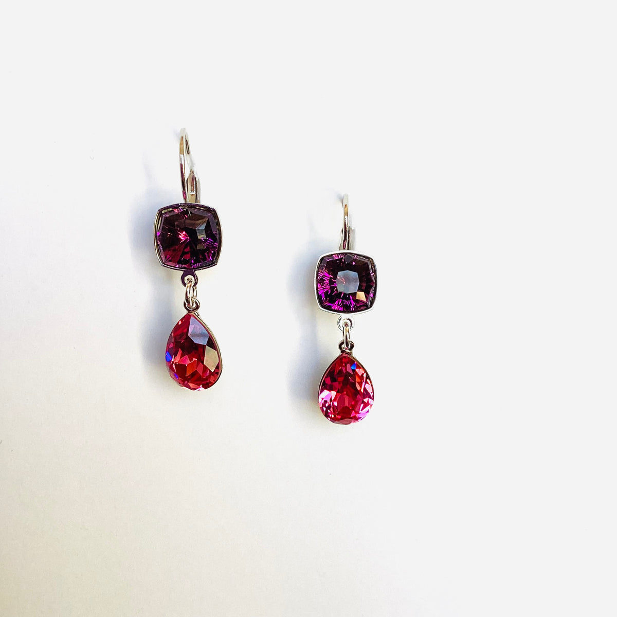 Perfectly Plum Drop Earrings set into Shiny Silver Metal with Amethyst and Rose Crystals.