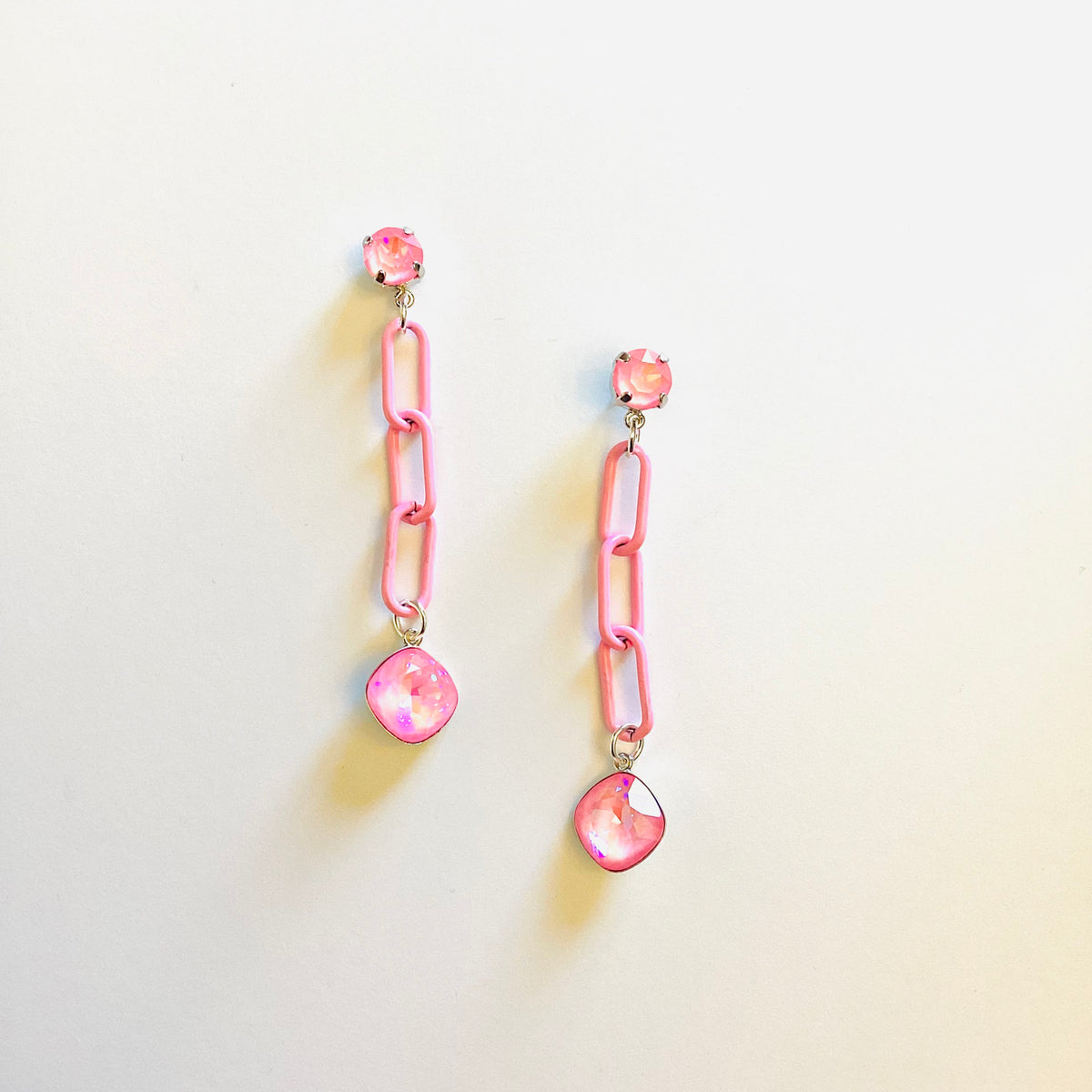 Petal Pink Chain Drop Earrings in Petal Pink Crystals set into Shiny Silver Metal