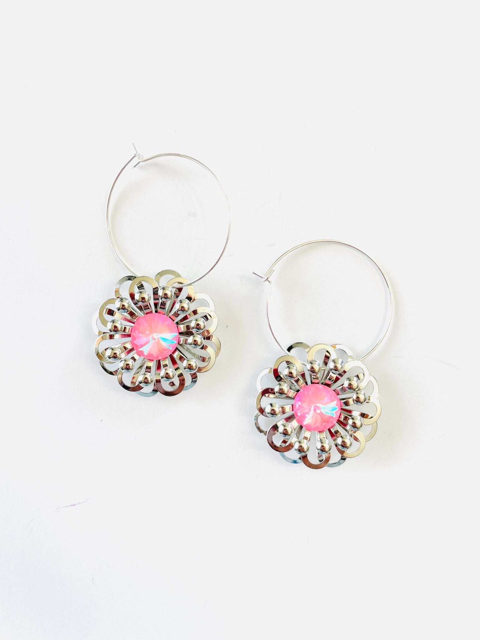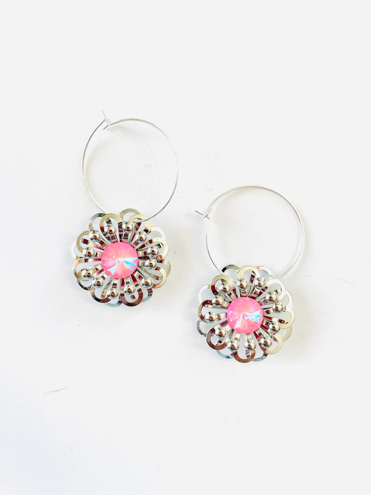 Petal Pink Flower Hoop Earrings set into Silver Plated Metal with Ultra Petal Pink Crystals.