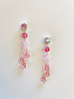Pink Raindrop Earrings set into Shiny Silver Metal with Light Rose, Light Rose AB, Rose AB Crystals. Pink Opal Beaded Chain.