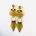Pot of Gold Long Earrings set into Gold Metal. Lightweight Crushed Metal Pendant with Gold Glitter Resin Pendant and Gold Metal Fringe. Golden Shadow Crystals.