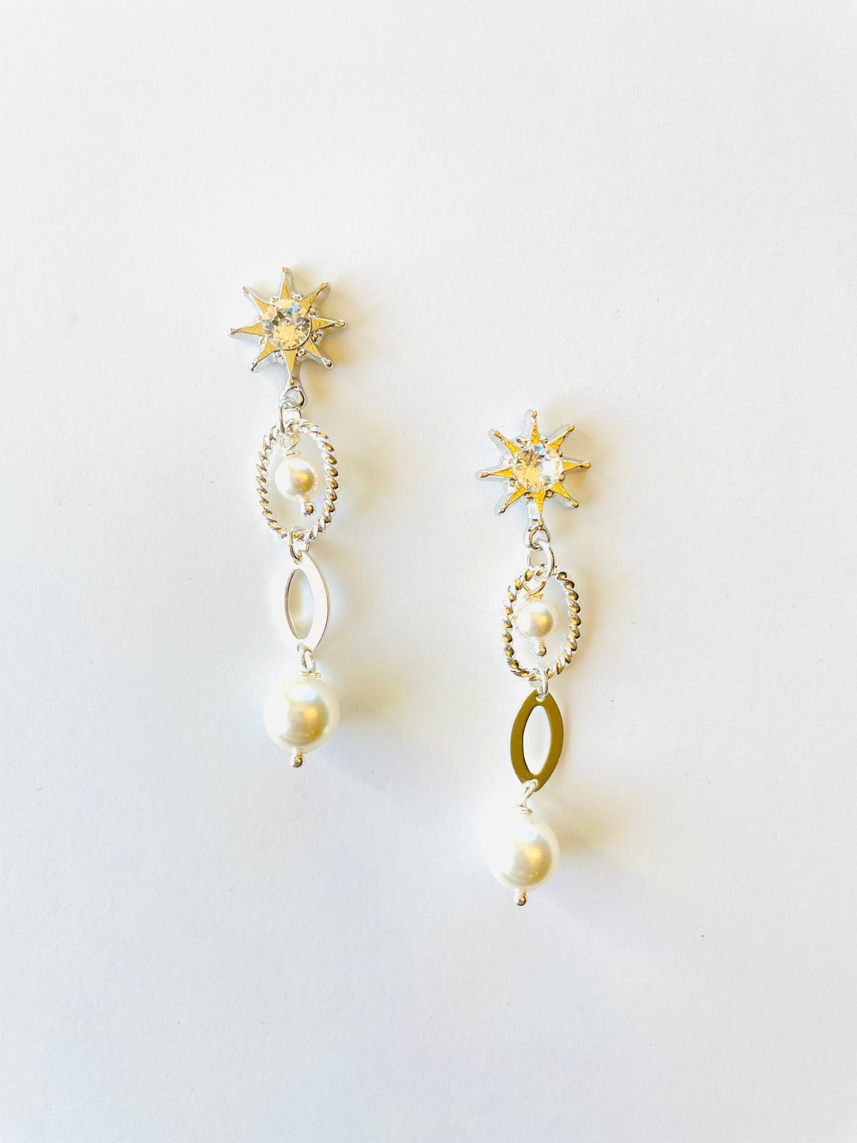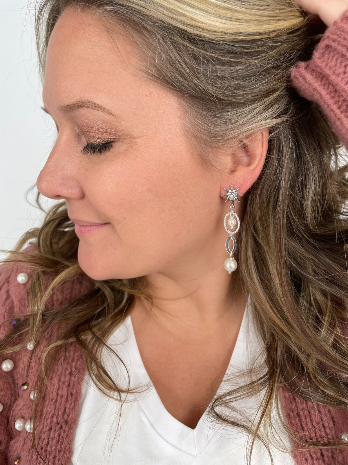 Precious Pearl Earrings set into Shiny Silver Metal with Crystal Crystals and White Pearls.