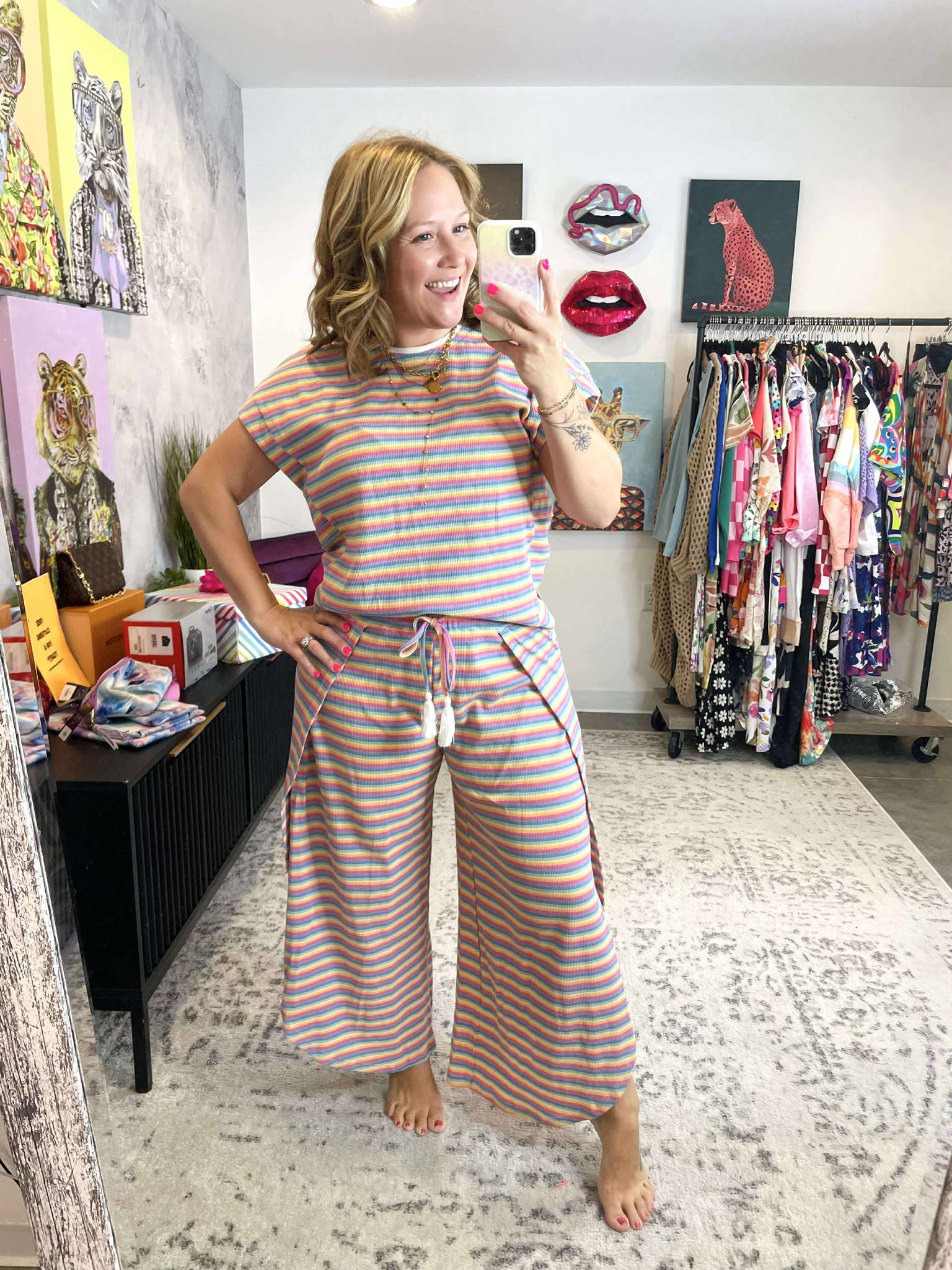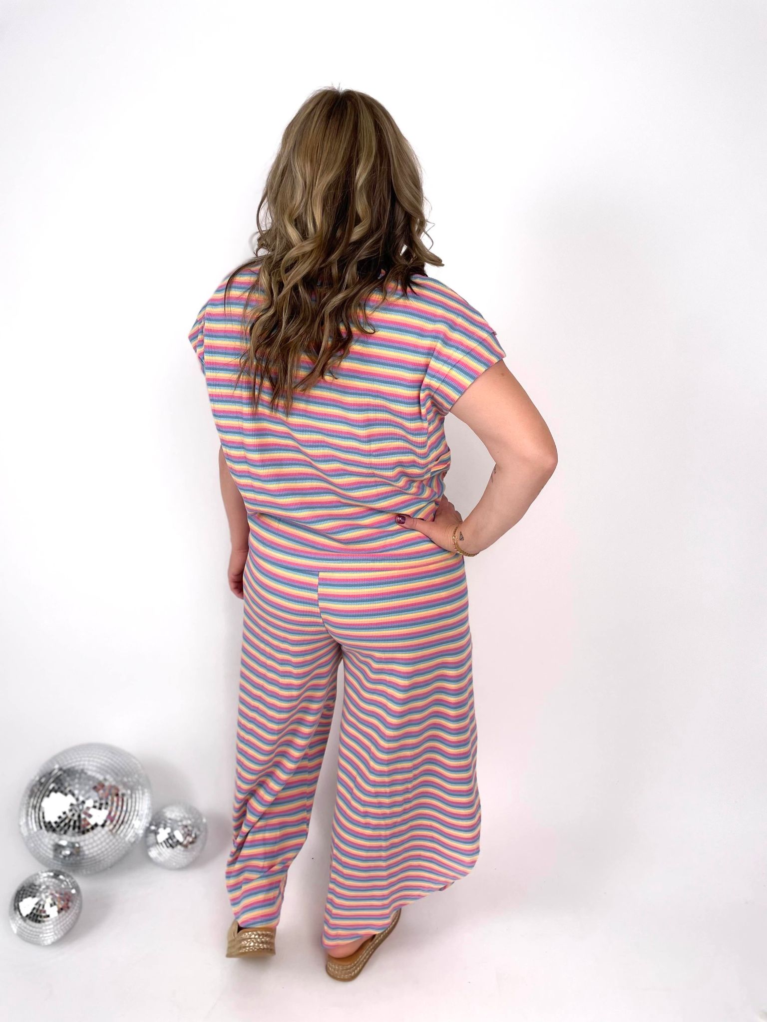 Get comfy and cute with our Rainbow Retreat Two-Piece Set! Featuring an elastic waist and drawstring for a perfect fit, this ribbed/waffle texture set is made for cozy retreats and lounging in style. Perfect for a playful and relaxed vibe.